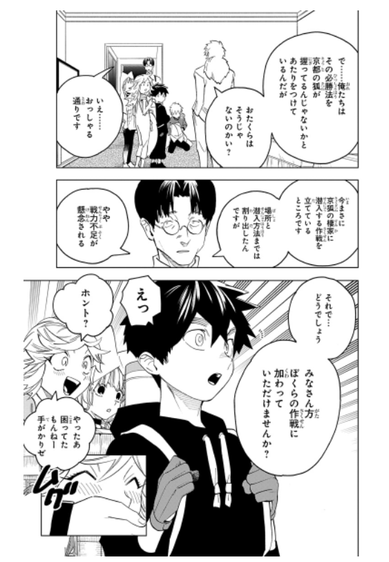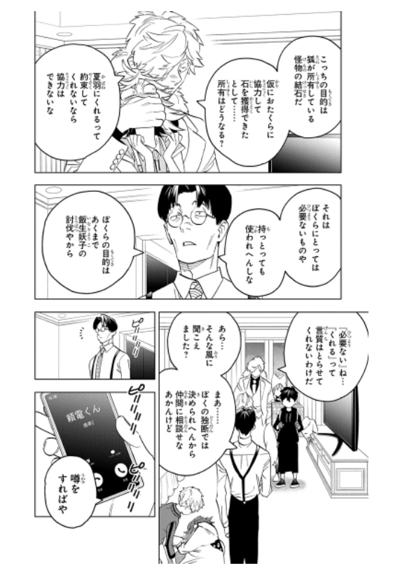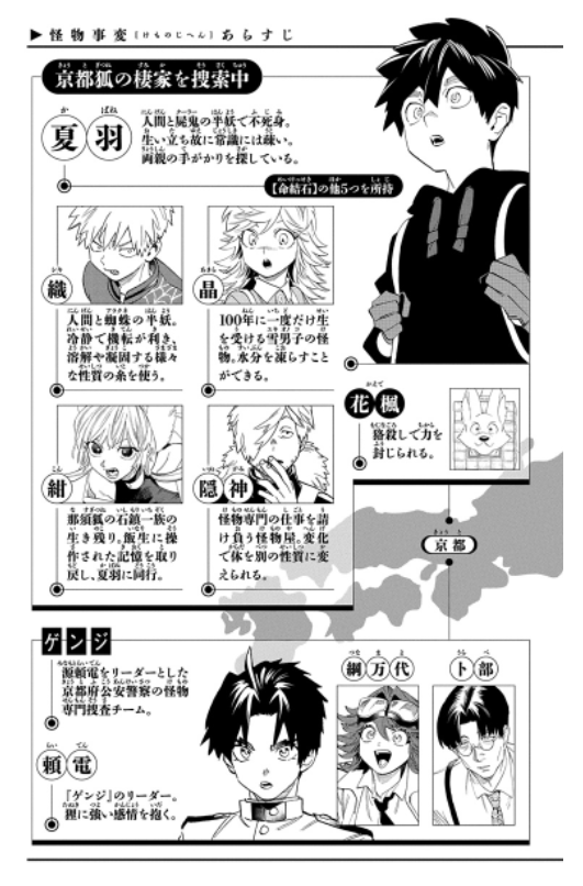 飯生の過去を調べるべく、京都の狐を探す夏羽たちは現地で怪物捜査を専門とする京都府公安警察『ゲンジ』のメンバーと会ってみることになったのでございます。ですが『ゲンジ』に所属する者は全員が人間であり、中でもリーダーの源頼電は狸について特別な心情があるようで…。京狐の棲家への潜入計画を練る『ゲンジ』は夏羽たちに手合わせを提案するのですが、人間と怪物…うまく交わるのでしょうか?