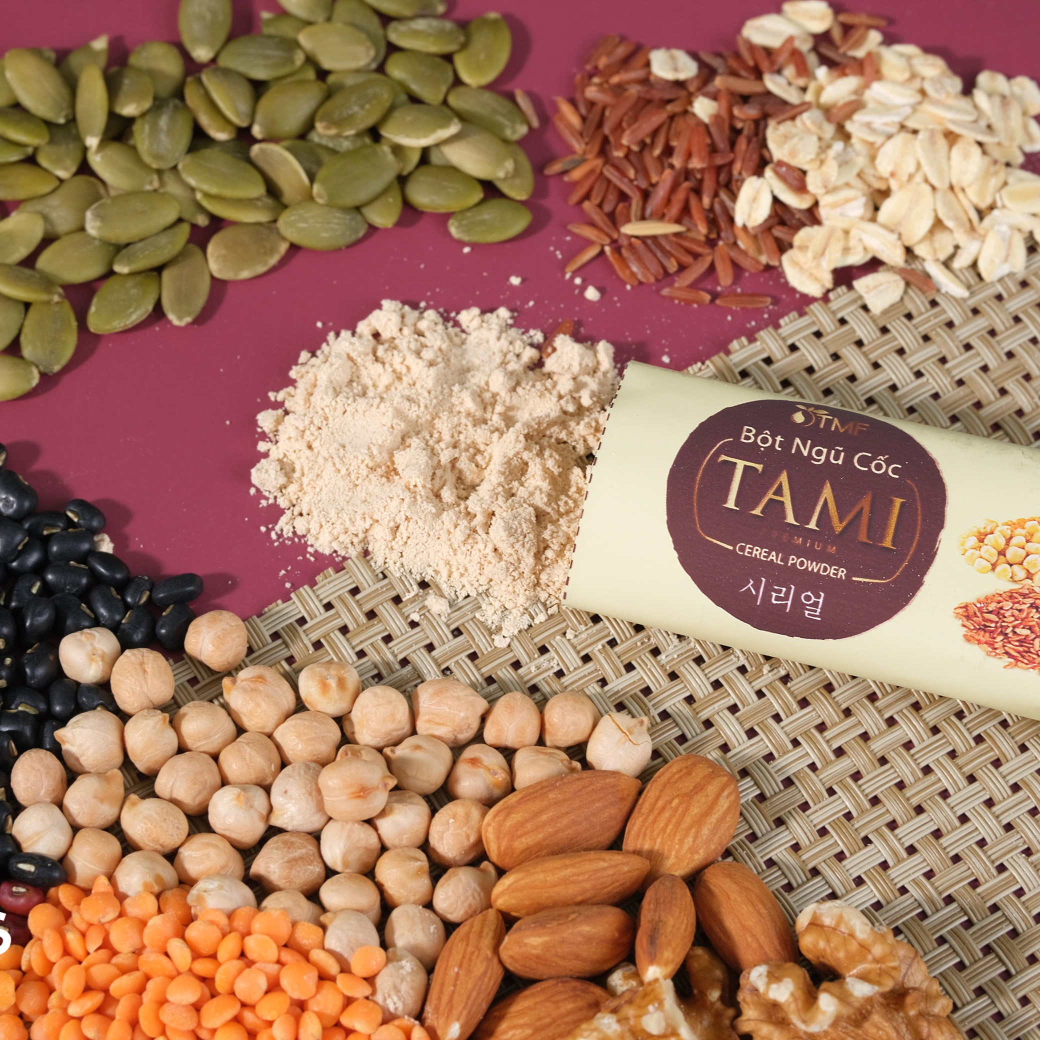 Bột ngũ cốc Tami có thành phần 100% thiên nhiên là các loại hạt đã được ngâm nảy mầm (gạo lứt, đậu đỏ, đậu gà); đậu lăng, yến mạch, óc chó, hạnh nhân, hạt bí,... Việc ngâm nảy mầm các loại hạt giúp loại bỏ các chất không tốt và phát huy tối đa các chất dinh dưỡng sẵn có trong hạt. Đồng thời sản phẩm hoàn toàn không có phẩm màu, không hương liệu, không chất bảo quản. Nhiều loại hạt có độ dinh dưỡng cao được kết hợp trong cùng một sản phẩm giúp bổ sung các vi chất thiết yếu.