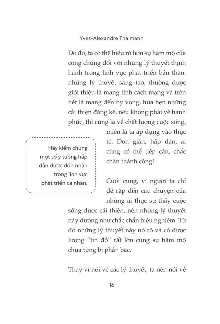 Trong cuốn sách 10 chìa khóa phát triển bản thân. Điều thực sự giúp bạn hạnh phúc, dựa trên những khám phá mới nhất trong lĩnh vực tâm lý học và khoa học nhận thức, Yves-Alexandre Thalmann đã vén bức màn về những niềm tin vô căn cứ đang dần đưa bạn cách xa cánh cửa của hạnh phúc.