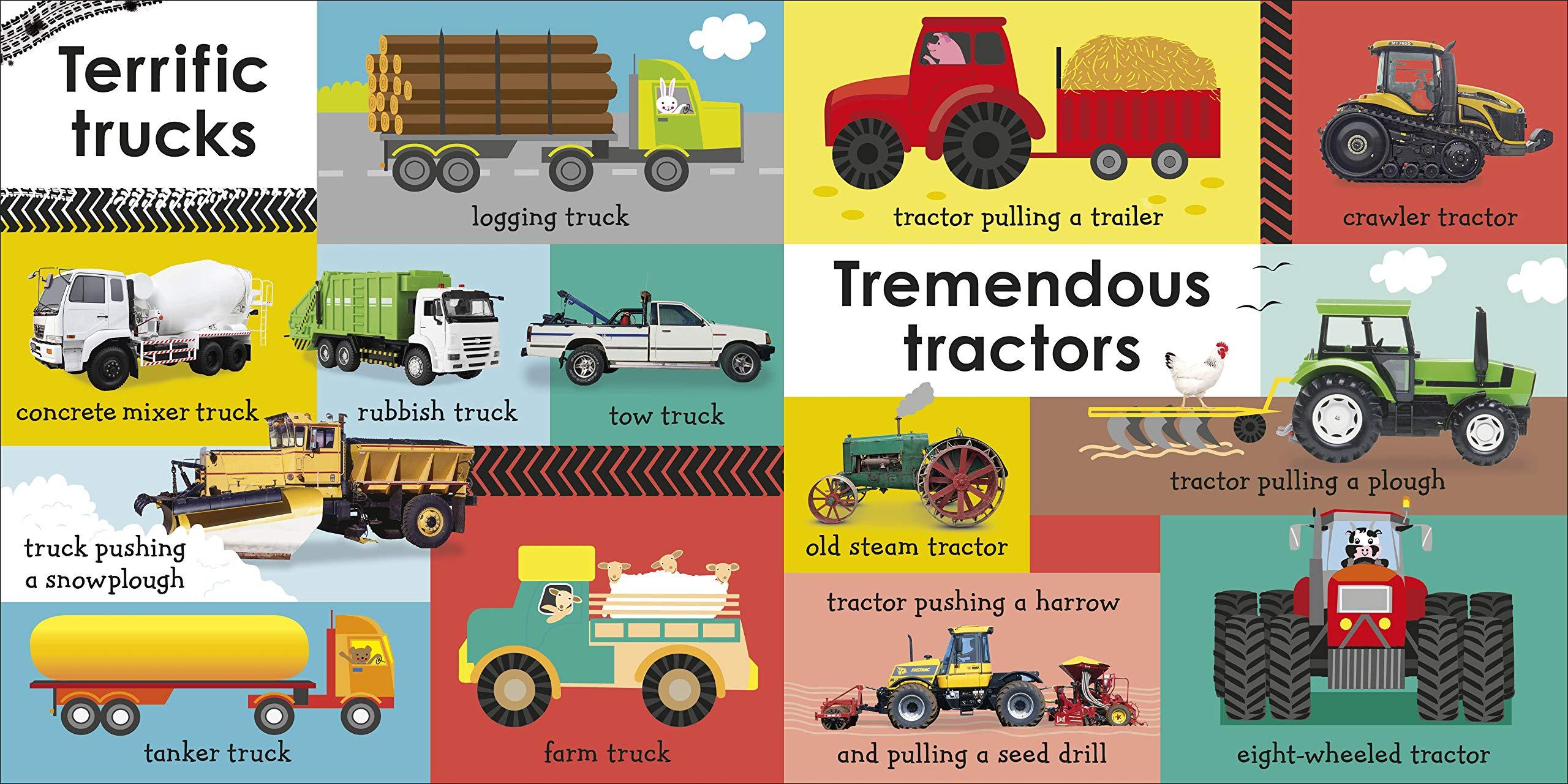 A fun-filled first introduction to transportation Jump aboard and point to the busy vehicles in this things that go baby book. Filled with cars, trucks, planes, boats, tractors, and diggers, it helps little ones learn first words and build vocabulary. Favourite vehicles are labelled on every page, and the exciting photos combined with fun illustrations provide lots to talk about, learn about, and smile about, making this colourful picture book great for sharing, and an attractive baby gift. Part of a beautiful, first word book series, which includes the award-winning 100 First Words and 100 First Animals, the big board book pages are toddler tough, and cover everything from cool cars, terrific trucks, and awesome fire engines, to vehicle colours and kids' own ride-on toys. There are even some entertaining make-believe things that go, such as a fantastic pirate ship and a magic broomstick.