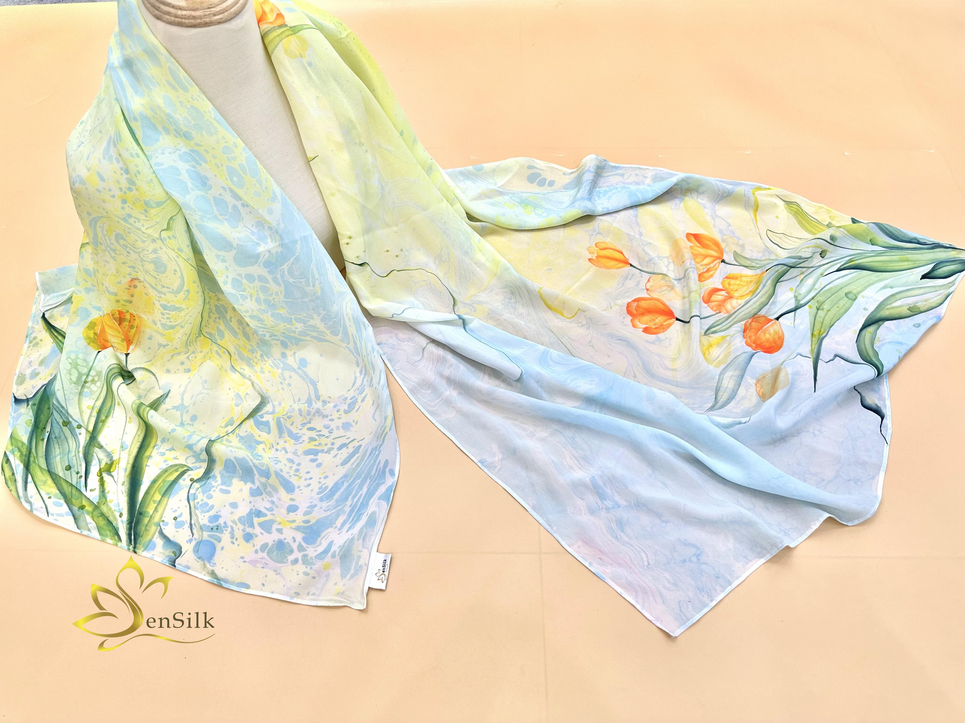 ĐẶC ĐIỂM NỔI BẬT CỦA KHĂN LỤA TƠ TẰM VẼ TAY THỦY ẤN SENSILK – WATER MARBLING SILK