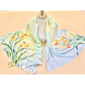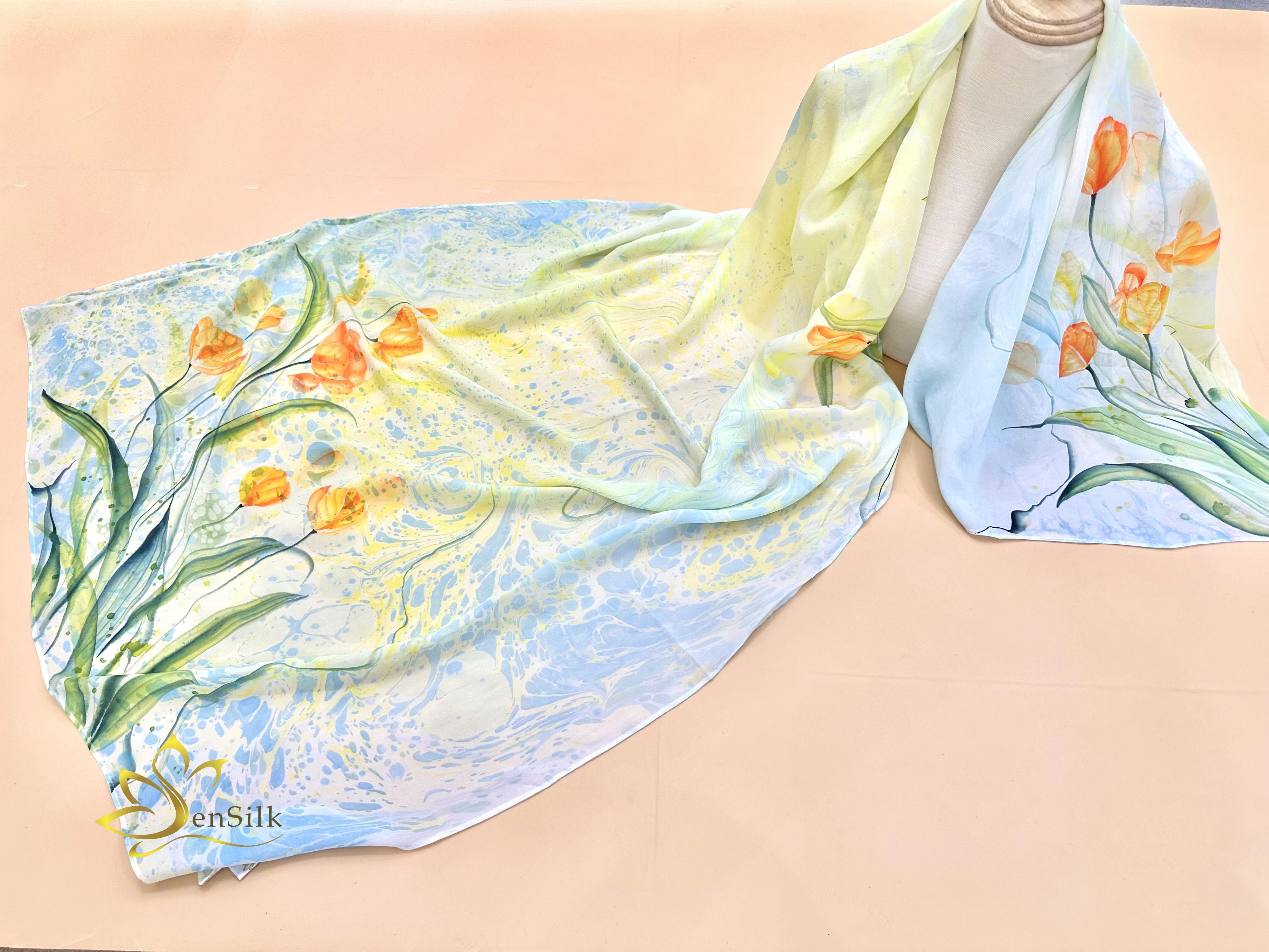 Khăn Lụa Cao Cấp Thuỷ Ấn Vẽ Hoa Tulip là hiện thân của tiền tài, sự nổi tiếng, danh vọng và tình yêu vẹn tròn. Ngoài ra, vì loài hoa này thường nở vào mùa xuân, xóa tan đi sự lạnh lẽo của ngày đông giá rét vì vậy, Tulip được xem là “sứ giả” lan tỏa sức sống tươi trẻ, biểu tượng cho cuộc sống vĩnh hằng.