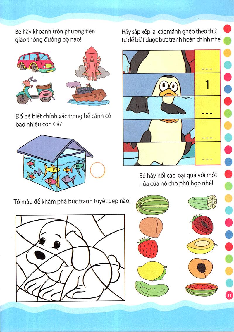 Quyển sách, có tô màu, có tính toán, có vẽ tranh, có trò chơi tìm đồ vật cất giấu, nối hình cho những sự vật hiện tượng có liêu quan, có tư duy logic… Bé từ đó được làm các dạng trò chơi khác nhau để phát triển về tư duy. Thông qua các trò chơi tư duy này, bạn có thể giúp bé rèn luyện trí não một cách tốt nhất, giúp bé biết hệ thống, luôn tự tin và biết cách xử lý các tình huống một cách nhạy bén hơn.