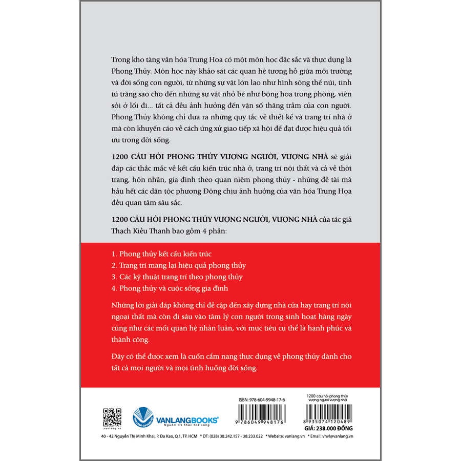1200 câu hỏi phong thủy vượng người, vượng nhà của tác giả Thạch Kiều Thanh bao gồm 4 phần: