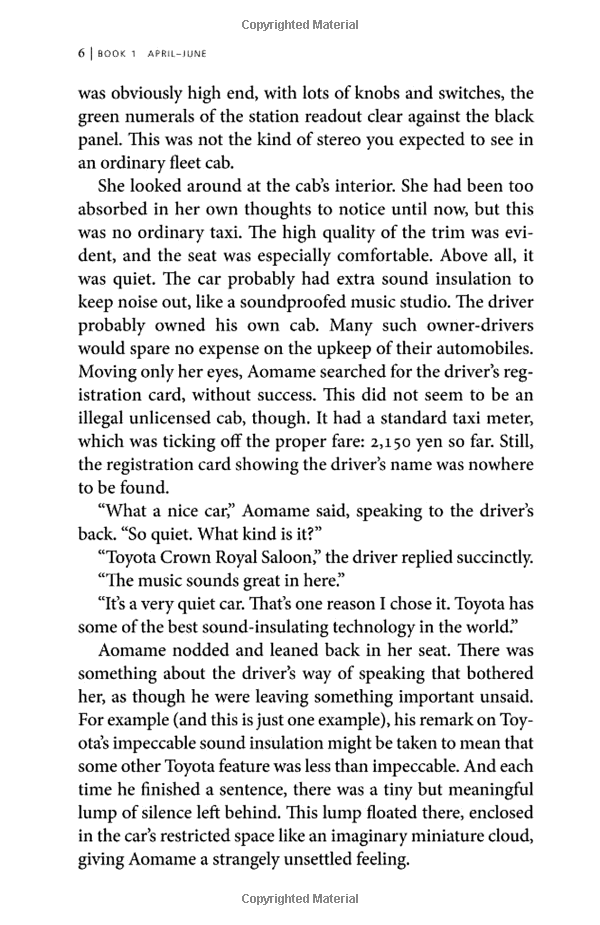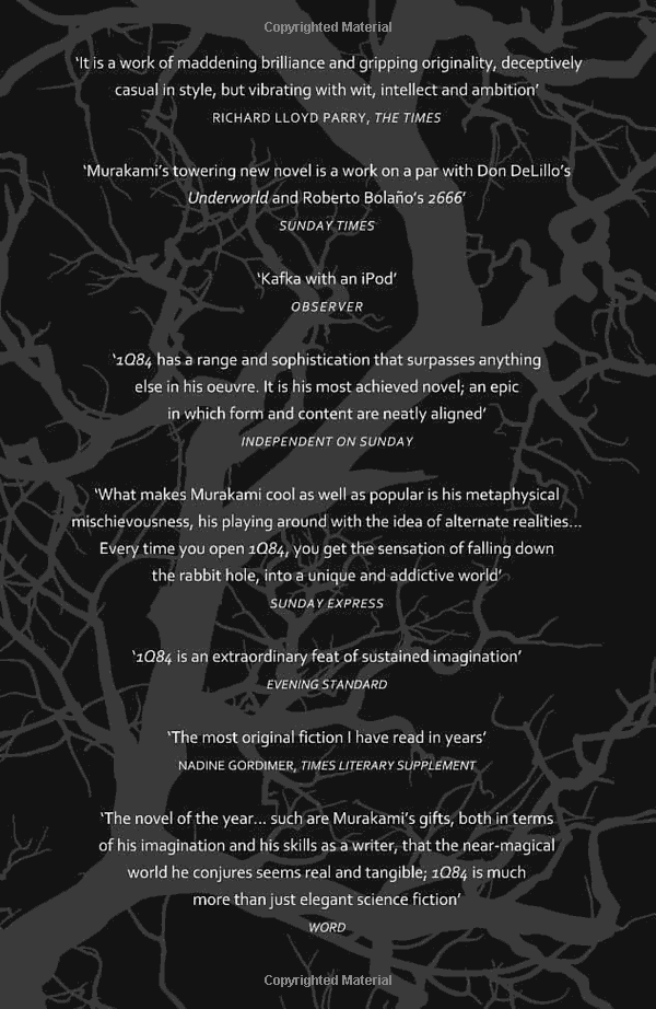 In this world, the fates of two people, Tengo and Aomame, are closely intertwined. They are each, in their own way, doing something very dangerous. And in this world, there seems no way to save them both.