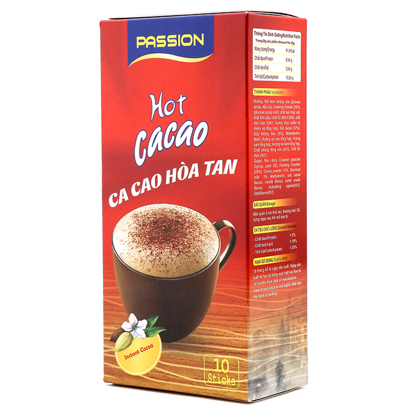 – Hỗ trợ phát triển chiều cao: Chococlate chứa vitamin D và canxi giúp hỗ trợ xương phát triển chắc khỏe, hỗ trợ phát triển chiều cao ở trẻ. Một số loại thức uống chocolate dành cho trẻ nhỏ còn được bổ sung thêm canxi để đáp ứng nhu cầu tăng trưởng theo độ tuổi. – Tăng cường thị lực: Nghiên cứu của Đại học Reading (Anh) cho thấy cacao giúp cải thiện thị lực trong môi trường thiếu ánh sáng. Trong môi trường thiếu sáng, mắt cần một vài giây để thích nghi, mới có thể theo dõi được các chuyển động diễn ra trong bóng tối. Cacao có tác dụng giảm khoảng thời gian thích nghi này, giúp mắt quen với bóng tối nhanh hơn. Các nhà khoa học giải thích rằng, trong cacao chứa nhiều flavanol làm tăng lưu lượng máu lên não và tới võng mạc mắt. – Cung cấp năng lượng: Để phát triển toàn diện, trẻ cần được tham gia nhiều hoạt động thể chất để nâng cao tinh thần và rèn luyện sức khỏe. Cha mẹ có thể bổ sung năng lượng mỗi ngày để bé thoải mái hoạt động. Những lúc dạ dày trẻ “biểu tình” vì đói, một tách Ca cao Pasion Hot là một món uống nhẹ nhàng đơn giản để bé nạp năng lượng tức thì. – Cải thiện trí nhớ: Một nghiên cứu năm 2013 của Đại học Havard (Mỹ) cũng phát hiện ra rằng, uống 2 cốc chocolate nóng tăng lưu lượng máu đến não trong vòng 2-3 giờ. Qua đó, cải thiện điểm số bài kiểm tra và tốc độ ghi nhớ lên đến 30%.   – Thành phần: Đường, Bột kem không sữa (glucose syrup, dầu cọ), Foaming Powder (glucose syrup solid, chất béo thực vật, chất khô sữa, chất ổn định E340ii, chất nhũ hóa E481, hương thực phẩm tự nhiên và tổng hợp), Bột cacao (12%), Sữa không béo (3%), Maltodextrin, Muối, Hương ca cao tổng hợp, Hương vani tổng hợp, Hương bơ kem tổng hợp – Hướng dẫn sử dụng: Đổ một gói ca cao hiệu Passion Hot Cacao vào ly. Thêm 50 ml nước nóng và khuấy nhẹ cho đến khi tan hoàn toàn. Để một lúc cho bọt nổi lên rồi thưởng thức hương vị thơm ngon của ca cao hiệu Passion Hot Cacao.