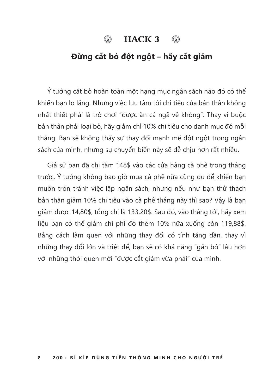 Những ý tưởng lớn không phải lúc nào cũng giúp bạn có thêm nhiều tiền nhưng các BÍ KÍP NHỎ thì có thể khiến chiếc ví của bạn dày lênmỗi ngày. Với 200+ Bí kíp dùng tiền thông minh dành cho người trẻ, bạn có thể “dắt túi” vô vàn kỹ năng tài chính có ích: vượt qua cái bẫy tiêu dùng và trở thành người tiết kiệm thông thái;, thoát khỏi nợ nần, quản lý dòng tiền và tiến tới cái đích ĐỘC LẬP TÀI CHÍNH.
