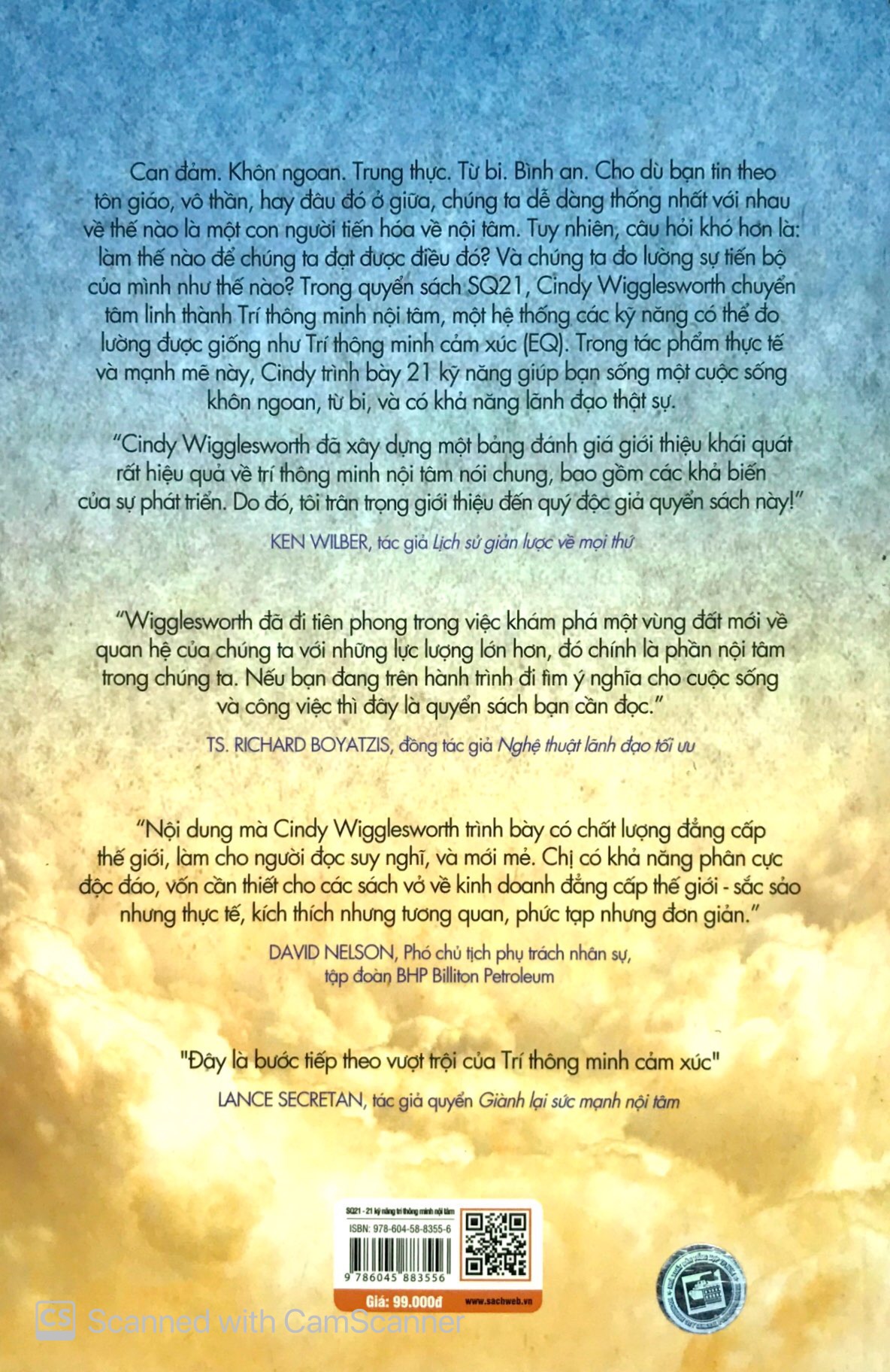 Trí thông minh nội tâm, viết tắt là SQ, ngày càng được nhiều người công nhận là thiết yếu cho sự phát triển của cá nhân và kỹ năng lãnh đạo của các tổ chức, công ty. Với cách tiếp cận thực dụng mới mẻ, Cindy Wigglesworth đã tiên phong xây dựng công cụ đánh giá trí thông minh nội tâm dựa trên năng lực có tên là SQ21. Cuốn sách là một công cụ quý giá dành cho các nhà lãnh đạo, nhà giáo dục, huấn luyện viên, tư vấn viên, và tất cả những ai đang đi tìm một phương cách hiệu quả, lý tính và tổng thể nhằm phát triển và đo lường đời sống nội tâm của mình.