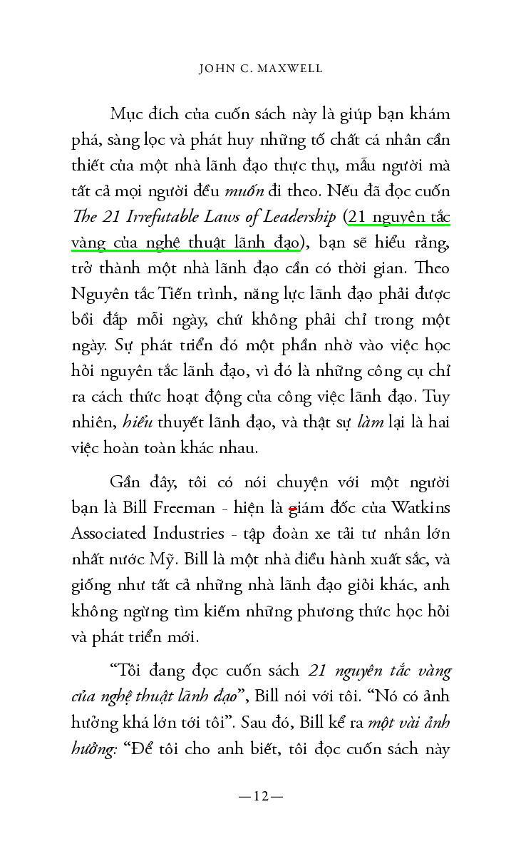 Chìa khóa biến bạn từ người nắm vững nguyên tắc lãnh đạo thành nhà lãnh đạo đích thực nằm ngay trong tính cách của bạn. Những phẩm chất, tính cách sẽ khơi nguồn, thúc đẩy tài năng lãnh đạo, và tạo dựng thành công cho bạn. Một phần năng lực phát triển mà nhà lãnh đạo có được là nhờ học hỏi các nguyên tắc. Đó là những công cụ rất hiệu quả. Nhưng muốn đạt đến cấp độ lãnh đạo cao nhất, bạn phải dựa vào sức mạnh nội tại – những phẩm chất làm nên con người bạn. Khi nghiên cứu về những nhà lãnh đạo vĩ đại, bạn sẽ thấy tất cả họ đều sở hữu 21 phẩm chất được đề cập trong cuốn sách này: sứs hút, lòng cản đảm, sự tận tâm, thái độ tich cực, tinh thần trách nhiệm… Nếu bạn có thể trở thành nhà lãnh đạo theo cách bạn nên làm từ bên trong, bạn có thể trở thành nhà lãnh đạo theo cách bạn muốn ở bên ngoài. Mục đích của cuốn sách này là giúp bạn khám phá, sàng lọc và phát huy những tố chất cá nhân cần thiết của một nhà lãnh đạo thực thụ, mẫu người mà tất cả mọi người đều muốn đi theo.