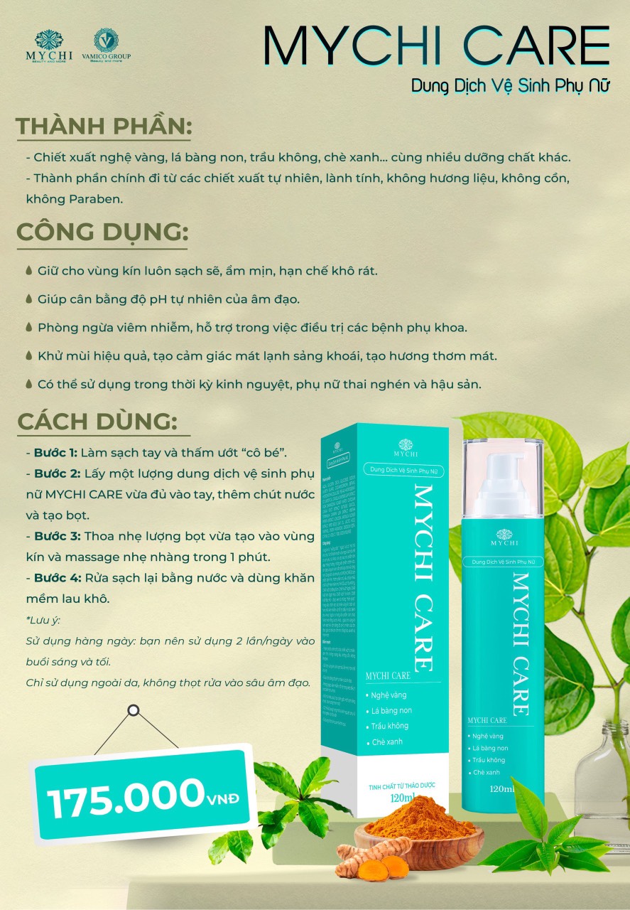 Dung dịch vệ sinh phụ nữ Mychi Care là sản phẩm lành tính, thành phần chủ yếu chứa nhiều chiết xuất thiên nhiên như Tinh Dầu Lá Trầu Không, Chiết Xuất Lá Bàng Non, Chiết Xuất Nghệ, Chiết Xuất Kim Ngân Hoa, Chiết Xuất Trà Xanh, Chiết Xuất Bạc Hà – được xem là những “ thần dược” trong việc chăm sóc sức khỏe vùg kin, bảo vệ, hạn chế viêm nhiễm và hỗ trợ bệnh phụ khoa. Ngoài ra trong sản phẩm còn chứa Nước hoa hồng, Lactic acid,… Giúp cho vùg kin luôn sạch sẽ, cân bằng pH, giúp cô bé luôn ẩm mịn, hồng hào, se khít và thơm mát.