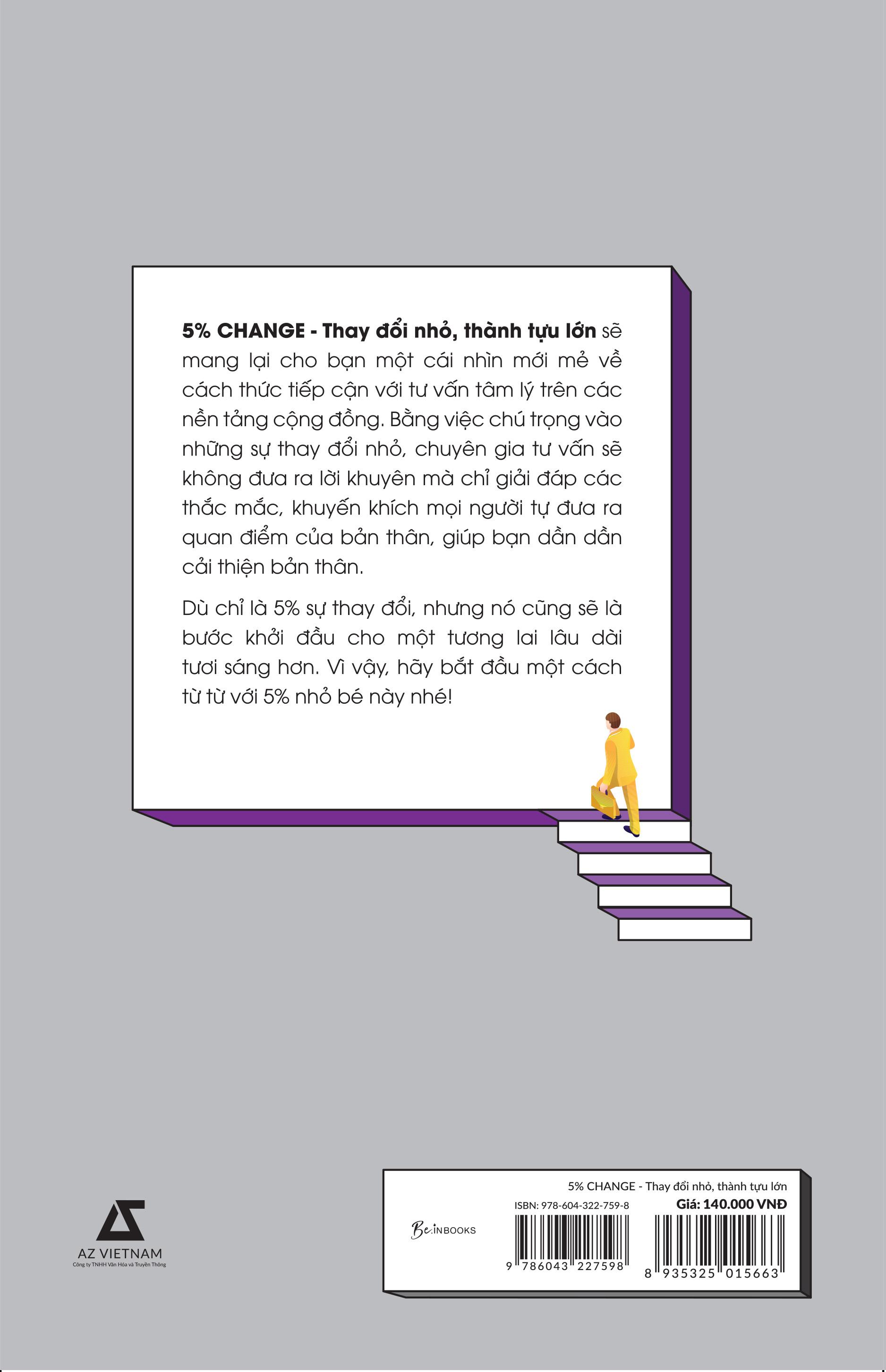 - Cuốn sách được trang Outlook Weekly của Tân Hoa Xã đề xuất năm 2023 Nếu bạn là kiểu người “suy tính rất nhiều nhưng không thể hành động”, hoặc bạn đã nghe không biết bao nhiêu lời khuyên đắt giá nhưng vẫn không thể sống tốt trên đời, có lẽ bạn đã mắc một sai lầm kinh điển: bạn muốn thay đổi cuộc sống của m.ình 100% ngay lập tức. Lý Tùng Úy - bác sĩ tâm lý đang “nổi đình nổi đám” trên mạng xã hội tại Trung Quốc có một cách tiếp cận khác: dù cuộc sống bạn có đang tệ thế nào, bạn hãy cứ giữ nguyên 95% bản thân m.ình như hiện tại. Phần lớn những chuyện xui xẻo trên đời không phải lỗi của bạn, mà do bạn đang ở sai chỗ, sai thời điểm, hoặc nhận định sai về chính m.ình mà thôi. Bạn chỉ cần thay đổi 5% then chốt là được rồi. Để chứng minh hiệu quả của luận điểm này, bác sĩ Lý đã mở hộp thư tư vấn tâm lý trên Internet, và chọn ra những trường hợp tiêu biểu nhất để phản hồi và ghi chép lại trong cuốn sách: “5% CHANGE - Thay đổi nhỏ, thành tựu lớn”. Cuốn sách là tập hợp 44 lá thư của độc giả nhờ bác sĩ Lý giải quyết những khúc mắc về cái tôi, gia đình, công việc và các mối quan hệ xã hội. Đối với mỗi trường hợp, bác sĩ Lý đều đặt thêm những câu hỏi cho độc giả tự khám phá vấn đề sâu hơn, và gợi ý độc giả thử một hành động nhỏ mà họ chưa từng thử rồi viết thư phản hồi lại cho anh.