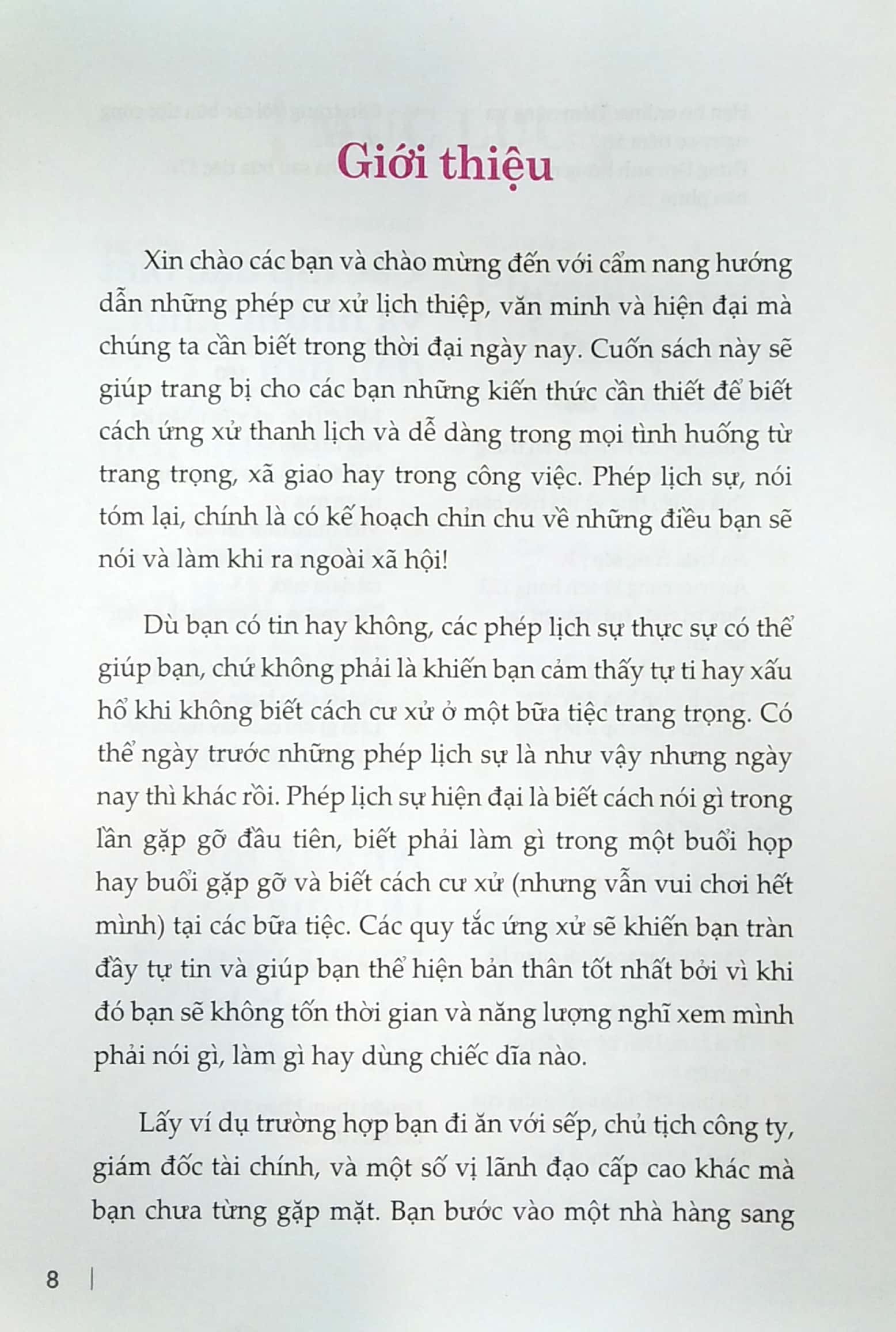 Gặp gỡ người lạ trong một bữa tiệc, đi chung thang máy với sếp lớn hay từ chối cuộc hẹn lần thứ hai vì cuộc hẹn đầu tiên thật thảm họa - các tình huống xã hội như vậy luôn đòi hỏi bạn phải làm và nói những điều phù hợp. 50 Bài Học Cơ Bản Để Trở Thành Người Lịch Thiệp sẽ chỉ cho bạn cách xử lý những thử thách thông thường này thật tự tin và dễ dàng. Hãy quên quy tắc phải dựng ngón tay út lên khi uống trà đi - cuốn sách này bao gồm rất nhiều ví dụ thời hiện đại về việc xử lý bất kì tình huống khó xử nào.