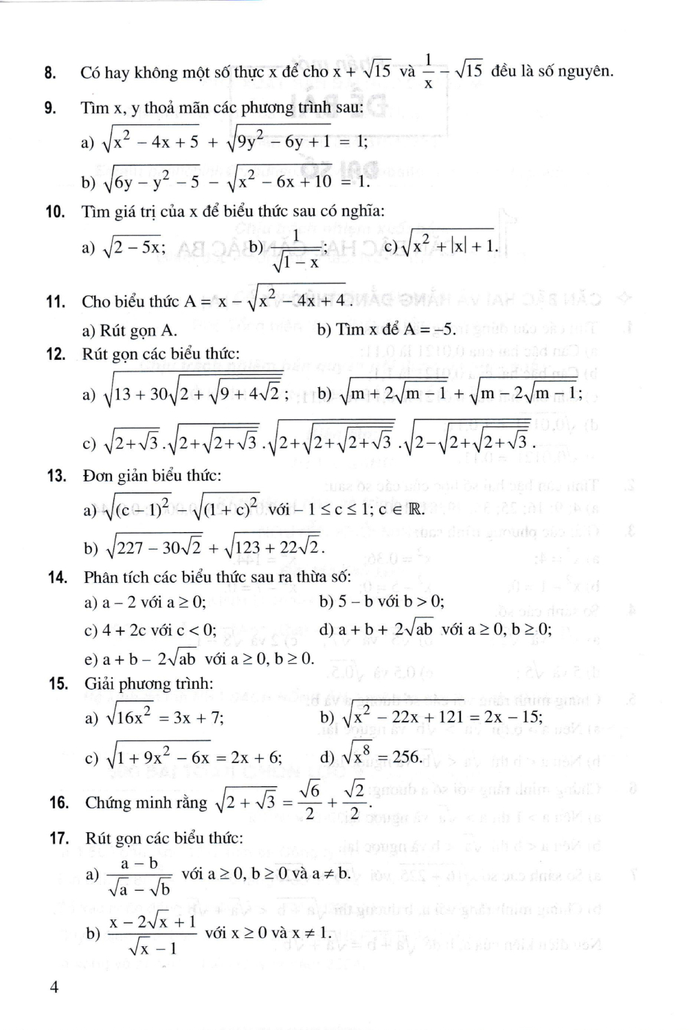 Cuốn sách gồm các chuyên đề sau : Chuyên đề 1. Biền đổi đồng nhất Chuyên đề 2. Biến đổi căn thức Chuyên đề 3. Xác định đa thức Chuyên đề 4. Hệ phương trình