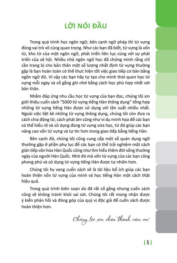 Tiếng hàn đối với bạn sẽ không còn nặng nề, mất thời gian như trước nữa. Việc chú trọng phát triển vốn từ vựng giờ đây chỉ cần bỏ vào túi thôi 5000 Từ Vựng tiếng hàn Thông Dụng Nhất là bạn có thể tung tăng giao tiếp bất cứ đâu và một sự tự tin mọi nơi khi đã nắm chắc trong tay 5000 từ vựng tiếng hàn thông dụng của The Changmi Còn chần chừ gì nữa mà không đặt mua ngay cuốn sách tuyệt vời này nhé!