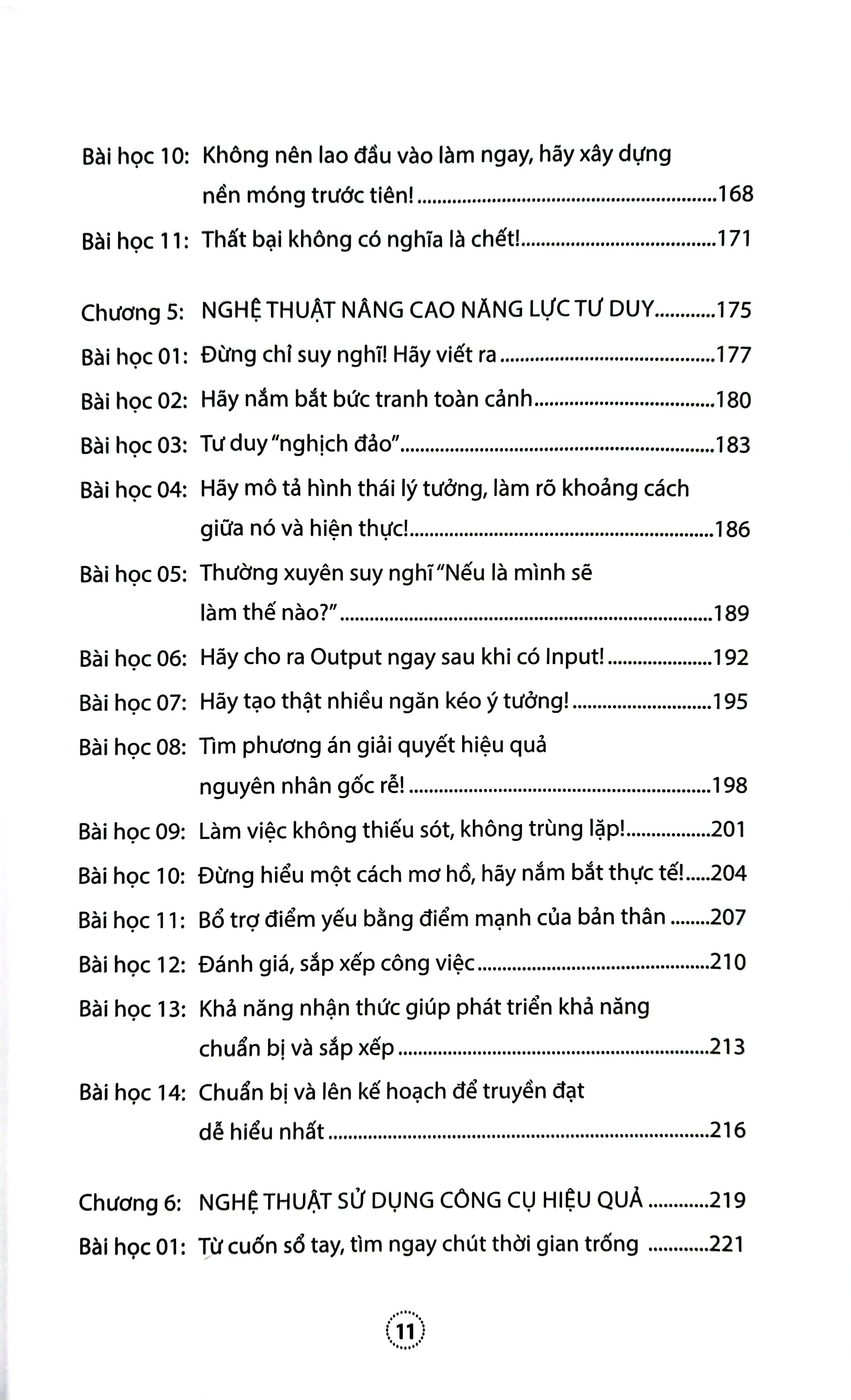 • Và giảng dạy tại nhiều trường đại học. Nếu bạn làm việc trong mơ hồ, sống những ngày tháng mơ hồ, thì cuộc đời bạn cũng có nguy cơ kết thúc trong mơ hồ. Bạn nên nhìn nhận nguy cơ ấy để phấn đấu. Thời còn đi học, ở một mức độ nhất định chúng ta có thể tiến hành mọi việc suôn sẻ chỉ cần dựa theo những thời gian biểu sẵn có. Tuy nhiên, những quy trình ấy sẽ mất đi khi bắt đầu đi làm. Bởi lẽ, chính bản thân chúng ta có nhiệm vụ tạo ra các quy trình đó. Nói đến sức mạnh của quá trình chuẩn bị và lên kế hoạch, không chỉ đối với công việc, nó còn cần thiết trong cả cuộc sống hằng ngày như khi chuyển nhà, trong các nghi thức quan trọng như kết hôn, tang lễ hay giỗ chạp, cho đến các môn thể thao như bóng chày, bóng đá. Chắc các bạn cũng đã từng có kinh nghiệm đến tham dự những buổi tiệc mà người chủ trì vụng về trong khâu chuẩn bị và lên kế hoạch đúng không? Tại nơi làm việc, dù bạn đang nắm giữ bất kỳ chức vụ hay đang đảm nhiệm công việc nào như bán hàng, lên kế hoạch hay tổng hợp, thì cũng cần kỹ năng phác thảo trước toàn bộ công việc để tiến hành suôn sẻ. Sản xuất, IT, tài chính, bất động sản, dịch vụ, hay bất cứ lĩnh vực kinh doanh nào khác cũng giống như vậy. Có thể nói chuẩn bị và lên kế hoạch là kỹ năng nền tảng mà người nào đi làm cũng cần trang bị cho bản thân. Tại các công ty, Những người kém kỹ năng này thường dễ bị gắn mác là trời sinh ra đã “dốt sẵn”, “tầm nhìn hạn hẹp”. Nhưng bằng việc rèn luyện, mỗi ngày chịu khó quan sát và hành động, chắc chắn thành quả sẽ tăng lên. Về cơ bản, cách chuẩn bị và lên kế hoạch có thể học được bằng cách quan sát những người xung quanh. Vì thế, không ít người đã hệ thống hóa và học cách chuẩn bị, lên kế hoạch cũng như cách tiến hành công việc. Vậy nên, trong cuốn sách này, tác giả đã chủ ý sắp xếp, kết hợp những ví dụ thực tế của bản thân cùng nhiều hình ảnh minh họa để hỗ trợ cho các độc giả trong việc hoàn thiện kỹ năng này. Nhà xuất bản và tác giả hy vọng các độc giả có thể vừa đọc vừa liên hệ với bản thân, suy ngẫm về những trường hợp cụ thể có thể áp dụng trong cuộc sống, kiểu như “cách làm này có vẻ áp dụng được cho công việc của m.ình!”, hay “m.ình sẽ thử bắt đầu cho đứa em cùng bộ phận!”. Nghệ thuật chuẩn bị và sắp xếp công việc - 77 thói quen làm việc hiệu quả giúp bạn có thêm những kĩ năng cần thiết để phát triển tư duy và hoàn thành tốt công việc. Nghệ thuật quản lý thời gian hiệu quả Nghệ thuật tăng tốc công việc Nghệ thuật triển khai dự án hiệu quả Nghệ thuật thúc đẩy động lực làm việc Nghệ thuật nâng cao năng lực tư duy Nghệ thuật sử dụng công cụ hiệu quả Nội dung chi tiết: Chương 1: NGHỆ THUẬT QUẢN LÝ THỜI GIAN HIỆU QUẢ Bài học 01: Tạo khoảng thời gian tập trung, loại bỏ triệt để những yếu tố cản trở công việc Bài học 02: Dù vội cũng đừng đi đường tắt Bài học 03: Thiết lập thời gian tiêu chuẩn Bài học 04: Mua thời gian! Bài học 05: Thiết lập kỳ hạn cho từng công việc Bài học 06: Đừng bao giờ nói “Tôi bận” Bài học 07: Bí quyết nâng cao hiệu suất - “tiến hành đồng thời” Bài học 08: Trở thành nhân viên không làm thêm giờ Bài học 09: Công việc không cần kết quả hoàn hảo, chỉ cần hoàn thành “đại khái” Bài học 10: Người chuẩn bị tốt sẽ huy động được người khác làm cùng Bài học 11: Thoải mái làm việc để tạo ra thành quả lớn! Bài học 12: Trước cuộc họp hay buổi thương thảo, hãy gửi với nội dung “Ngày mai mong anh giúp đỡ” sẽ tạo được hiệu quả Chương 2: NGHỆ THUẬT TĂNG TỐC CÔNG VIỆC Bài học 01: “Hãy coi trọng thời gian, dù chỉ 5 phút” Bài học 02: Dừng việc gửi mail từng li từng tí lại. Hãy gọi điện thoại ngay tức khắc Bài học 03: Thời gian có thể tập trung, công việc có thể tập trung Bài học 04: Phải cần cù xúc tiến công việc từng bước một Bài học 05: Bắt tay làm từ những việc đơn giản và có hiệu quả Bài học 06: Không nên nhầm lẫn công việc nên làm với công việc cần phải làm Bài học 07: Xử lý trước các công việc nhỏ nhặt! Bài học 08: Đừng đặt mục tiêu làm một lần OK luôn Bài học 09: Đừng để bị cấp trên sử dụng, hãy sử dụng cấp trên Bài học 10: Hãy mạnh dạn từ bỏ công việc! Bài học 11: Xác nhận ngay tại cuộc họp! Bài học 12: Càng những công việc cảm thấy xấu hổ, càng phải xử lý sớm! Bài học 13: Chia nhỏ công việc Bài học 14: Quy tắc Ho-ren-so Chương 3: NGHỆ THUẬT TRIỂN KHAI DỰ ÁN HIỆU QUẢ Bài học 01: Hãy viết ra những việc ngày mai bạn phải làm Bài học 02: Đừng làm những công việc “làm cho xong”! Bài học 03: Hãy nghĩ cách chia nhỏ con đường dẫn đến đích! Bài học 04: Hãy nắm rõ những người liên quan xung quanh! Bài học 05: Phương pháp biến những người xung qua