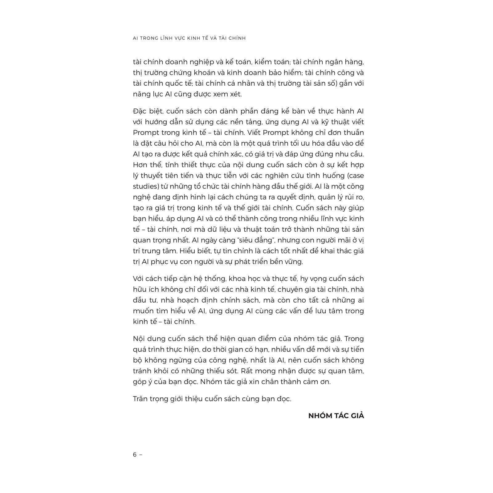 Cuốn sách bắt đầu bằng việc giới thiệu tổng quan về sự phát triển của AI, từ những ý tưởng sơ khai đến những bước tiến vượt bậc gần đây, làm rõ tiềm năng to lớn cũng như những rủi ro và thách thức mà AI mang lại. Sau đó đi sâu vào các khía cạnh kỹ thuật và ứng dụng cụ thể của AI trong kinh tế và tài chính. Trong lĩnh vực kinh tế, sách trình bày cách AI được sử dụng để dự báo GDP, lạm phát và thất nghiệp, phân tích hành vi người tiêu dùng và doanh nghiệp, quản lý chuỗi cung ứng sản xuất và phát triển kinh tế xanh. Trong lĩnh vực tài chính, sách đề cập đến hàng loạt các nội dung quan trọng như tài chính doanh nghiệp, kế toán kiểm toán, tài chính ngân hàng, thị trường chứng khoán, bảo hiểm, tài chính công, tài chính quốc tế, tài chính cá nhân và thị trường tài sản số.