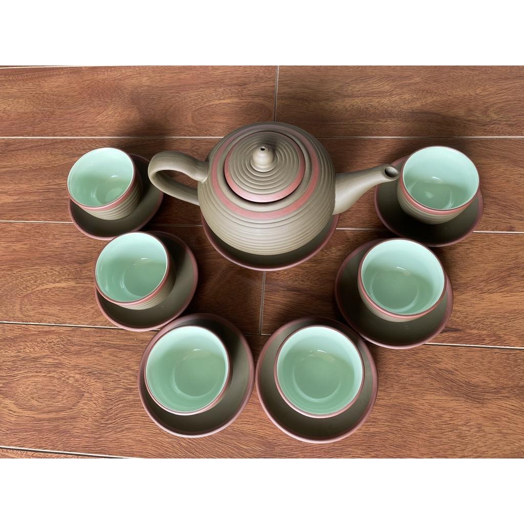 Ấm chén men xanh rêu đậm khắc hoạ tiết sen Gốm sứ Bát Tràng Bọc đồng cao cấp ĐẸP sang trọng và cuốn hút 1 ấm 6 chén 7 đĩa kê giá 1000k Phụ kiện