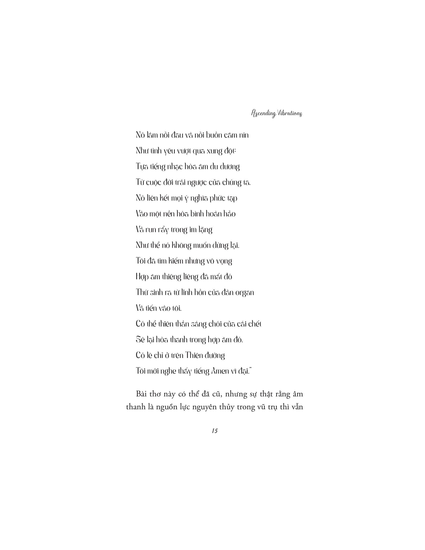 Âm Thanh Chữa Lành Thân Tâm Với nhịp sống hối hả hiện nay, mức độ căng thẳng ngày càng tăng khiến cơ thể và tâm trí bạn mệt mỏi. Âm nhạc và phương pháp trị liệu bằng âm thanh trở thành một trong số những phương pháp then chốt trong việc đ.iều trị tâm lý. Một trong những tác động đáng chú ý nhất của âm thanh và âm nhạc là khả năng ảnh hưởng đến tâm trạng. Một số âm thanh hoặc bản nhạc có thể khơi gợi những cảm xúc cụ thể như hạnh phúc, nỗi buồn hoặc nỗi nhớ. Ví dụ, nghe nhạc sôi động và lạc quan có thể tăng mức năng lượng, nâng cao cảm xúc tích cực và thúc đẩy cảm giác vui vẻ, nhiệt tình. Ngược lại, những giai điệu nhẹ nhàng, du dương có thể tạo bầu không khí yên tĩnh giúp chúng ta thư giãn, giảm căng thẳng. Cuốn sách "Âm Thanh Chữa Lành Thân Tâm" sẽ giúp bạn khai mở về sức mạnh của âm thanh trong việc chữa lành cả cơ thể lẫn tâm hồn. Cuốn sách tập trung vào việc giải thích cách mà âm thanh và các rung động có thể ảnh hưởng đến trạng thái năng lượng của con người, giúp xoa dịu căng thẳng, tái tạo năng lượng và kích hoạt các quá trình chữa lành tự nhiên từ bên trong. Tác giả dẫn dắt người đọc qua những ứng dụng khoa học, tâm linh và siêu hình của âm thanh, giải thích cách mà các liệu pháp âm thanh cổ xưa đã được sử dụng trong nhiều nền văn hóa khác nhau để chữa lành và cải thiện sức khỏe. Âm thanh không chỉ có khả năng tác động đến cảm xúc, mà còn có thể ảnh hưởng tích cực đến hệ thần kinh, hệ miễn dịch, và thậm chí là các luân xa, trung tâm năng lượng trong cơ thể con người. Với nhiều kỹ thuật và phương pháp trị liệu âm thanh khác nhau, những liệu pháp này giúp cơ thể thư giãn, giảm căng thẳng, loại bỏ tắc nghẽn năng lượng và khôi phục lại trạng thái cân bằng tự nhiên. Một trong những thông điệp quan trọng của cuốn sách là sự kết nối sâu sắc giữa con người và vũ trụ thông qua âm thanh. Các rung động âm thanh không chỉ giúp giải phóng những cảm xúc bị kìm nén, mà còn mở ra những con đường năng lượng, giúp con người tiếp cận những tần số cao hơn, mang lại sự bình an và nhận thức sâu sắc về sự hiện diện và vai trò của m.ình trong vũ trụ. "Âm thanh chữa lành thân tâm" là một cuốn sách không chỉ dành cho những người muốn tìm hiểu về âm nhạc và trị liệu, mà còn cho bất kỳ ai mong muốn khám phá sự kết nối giữa thân, tâm và vũ trụ thông qua các rung động của âm thanh. Về Tác giả: Ascending Vibrations là một nhóm xuất bản độc lập dành riêng cho những ai muốn mở rộng ý thức và nâng cao sự tồn tại của họ. Họ muốn mang đến sự gia tăng nhận thức có ý thức trong thế giới hiện đại với các tác phẩm sâu sắc và dễ hiểu về các yếu tố tâm linh cốt lõi như chánh niệm, tăng cường luân xa, bí mật chữa bệnh bằng âm thanh, kiến thức cổ xưa, kỹ thuật yoga, v.v.