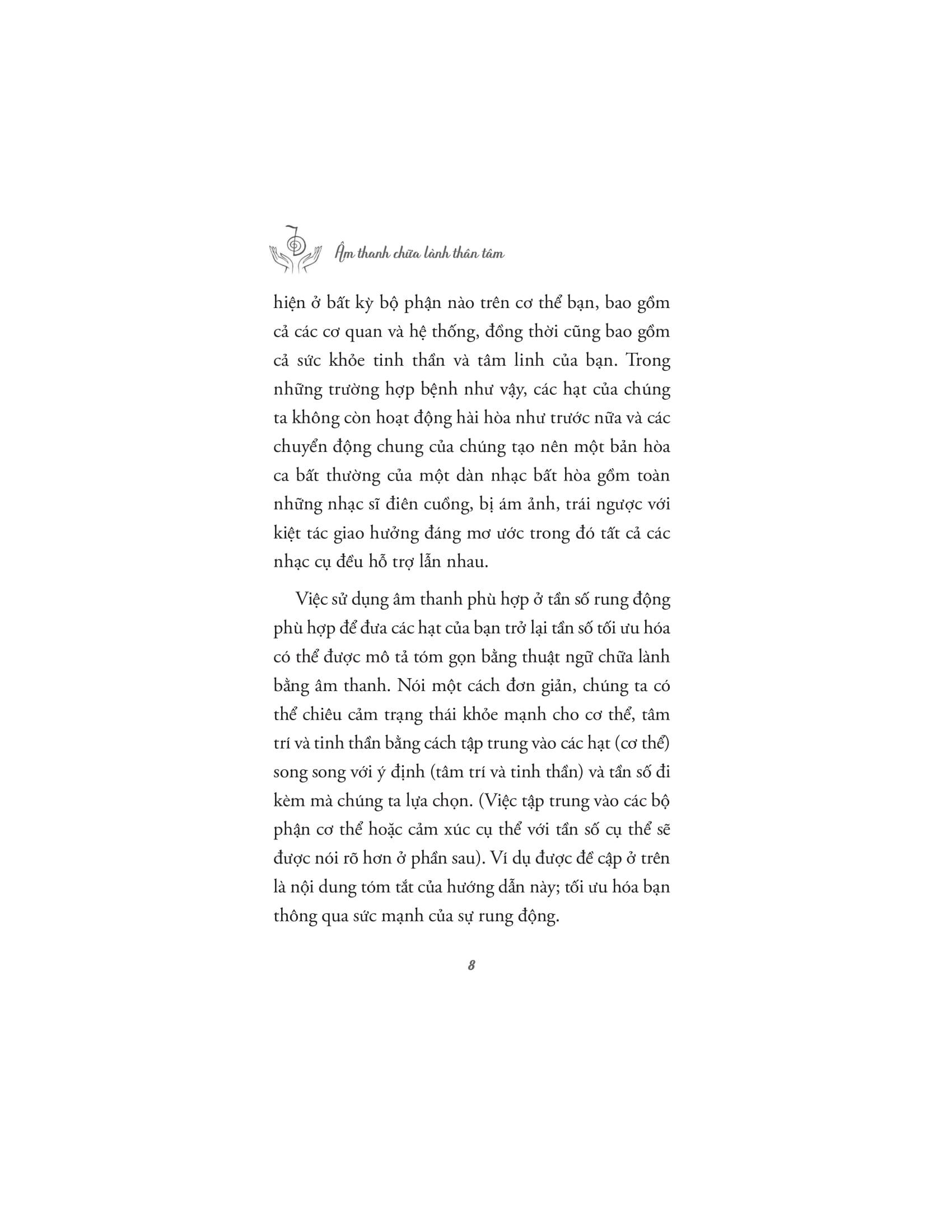 Tác giả dẫn dắt người đọc qua những ứng dụng khoa học, tâm linh và siêu hình của âm thanh, giải thích cách mà các liệu pháp âm thanh cổ xưa đã được sử dụng trong nhiều nền văn hóa khác nhau để chữa lành và cải thiện sức khỏe. Âm thanh không chỉ có khả năng tác động đến cảm xúc, mà còn có thể ảnh hưởng tích cực đến hệ thần kinh, hệ miễn dịch, và thậm chí là các luân xa, trung tâm năng lượng trong cơ thể con người. Với nhiều kỹ thuật và phương pháp trị liệu âm thanh khác nhau, những liệu pháp này giúp cơ thể thư giãn, giảm căng thẳng, loại bỏ tắc nghẽn năng lượng và khôi phục lại trạng thái cân bằng tự nhiên.