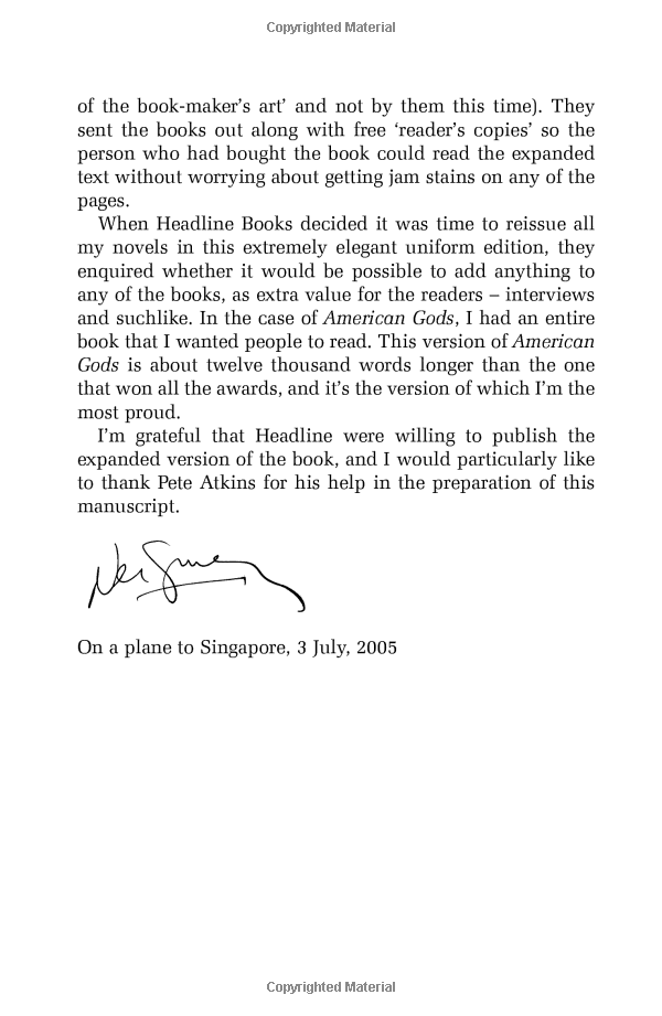 First published in 2001, American Gods became an instant classic, lauded for its brilliant synthesis of “mystery, satire, sex, horror, and poetic prose” (Washington Post) and as a modern phantasmagoria that “distills the essence of America” (Seattle Post-Intelligencer). It is the story of Shadow—released from prison just days after his wife and best friend are killed in an accident—who gets recruited to be bodyguard, driver, and errand boy for the enigmatic trickster, Mr. Wednesday. So begins Shadow’s dark and strange road trip, one that introduces him to a host of eccentric characters whose fates are mysteriously intertwined with his own. For, beneath the placid surface of everyday life, a storm is brewing—an epic war for the very soul of America—and Shadow is standing squarely in its path.