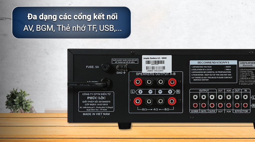 Mua tại TiktokAmply Zenbos LX-6800 800W- Số lượng kênh: 2 kênh- Tổng công suất: 800W- Nguồn: 220V- Phím điều khiển: Nút bấm và nút vặn cơ học- Kết nối không dây: Bluetooth- Cổng phát nhạc: AV- Thẻ nhớ TF, Jack 3.5 mm, USB- Khoảng cách kết nối tối đa: 10m- Điều khiển bằng điện thoại: Có- Kích thước: 42x25x14 cm - Nặng: 6.5 kg- Sản xuất tại: Việt Nam- Hãng: Zenbos
