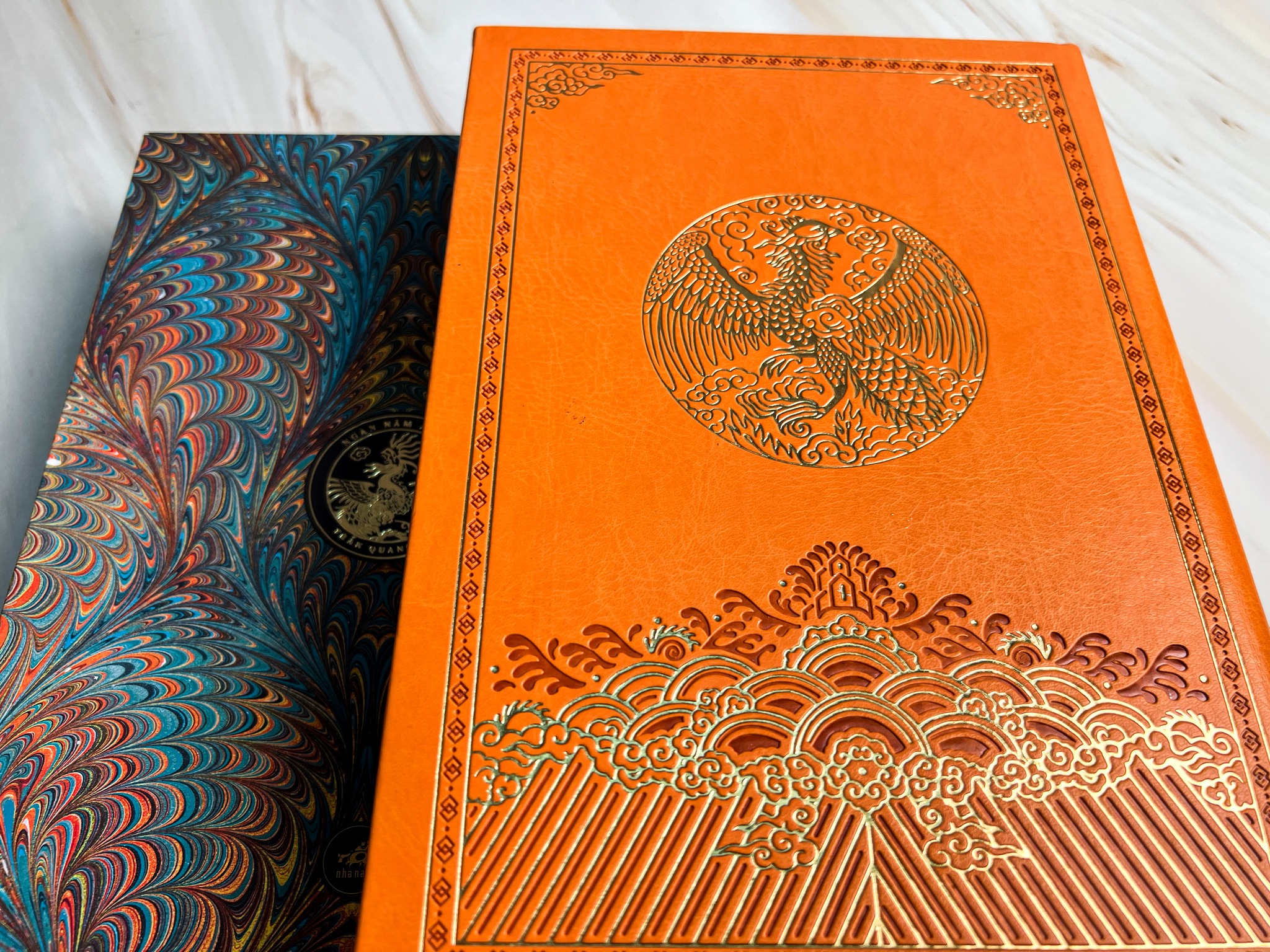- Bìa sách được làm từ da PU, màu cam sáng, bồi trên carton 3 li
