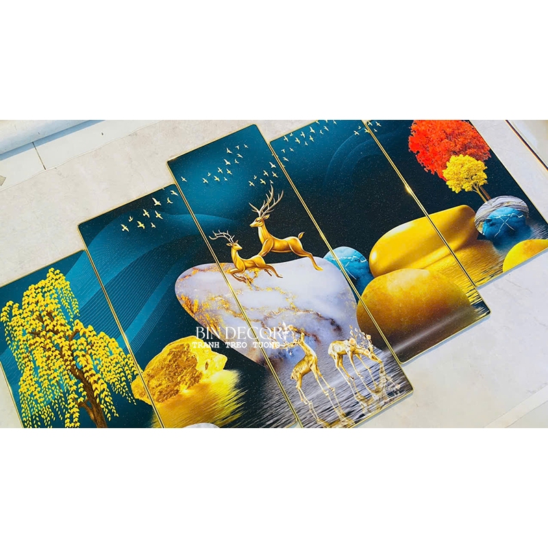 ✨(ẢNH THẬT) Tranh treo tường hươu vàng trên đá cuội bộ 5 tấm bo viền kèm đinh treo