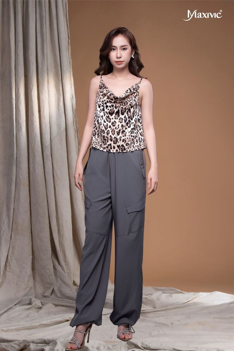 - Thiết kế kiểu áo cổ đổ cổ điển giúp vòng 1 trông đầy đặn hơn, kết hợp cùng hoạ tiết da báo mang lại diện mạo cá tính, trẻ trung và thu hút.