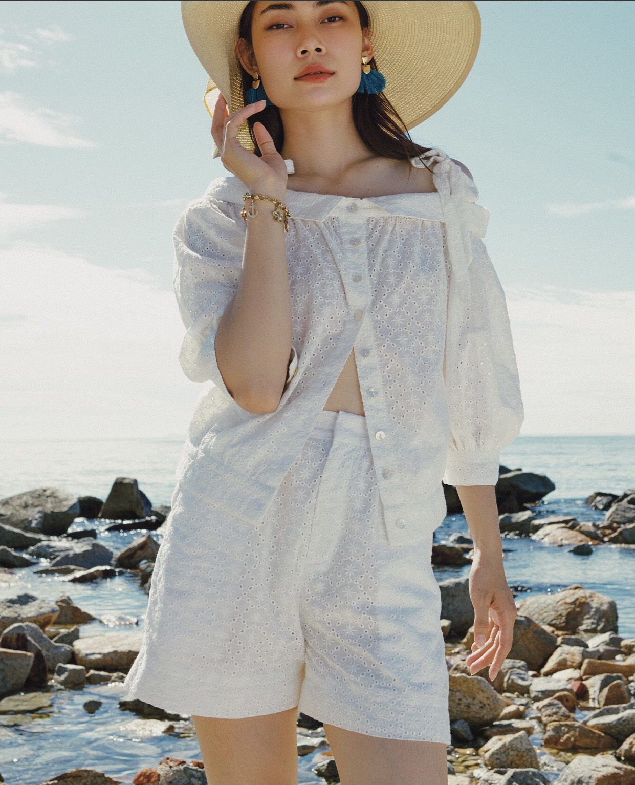 Thiết kế áo trễ vai croptop thắt nơ vai phối chung với quần đồng bộ cotton thêu trắng có thể kết hợp với nhiều phụ kiện khác nhau như sandal, giày cao gót, túi xách,... tạo nên phong cách thời trang đa dạng, phù hợp cho nhiều hoàn cảnh khác nhau.