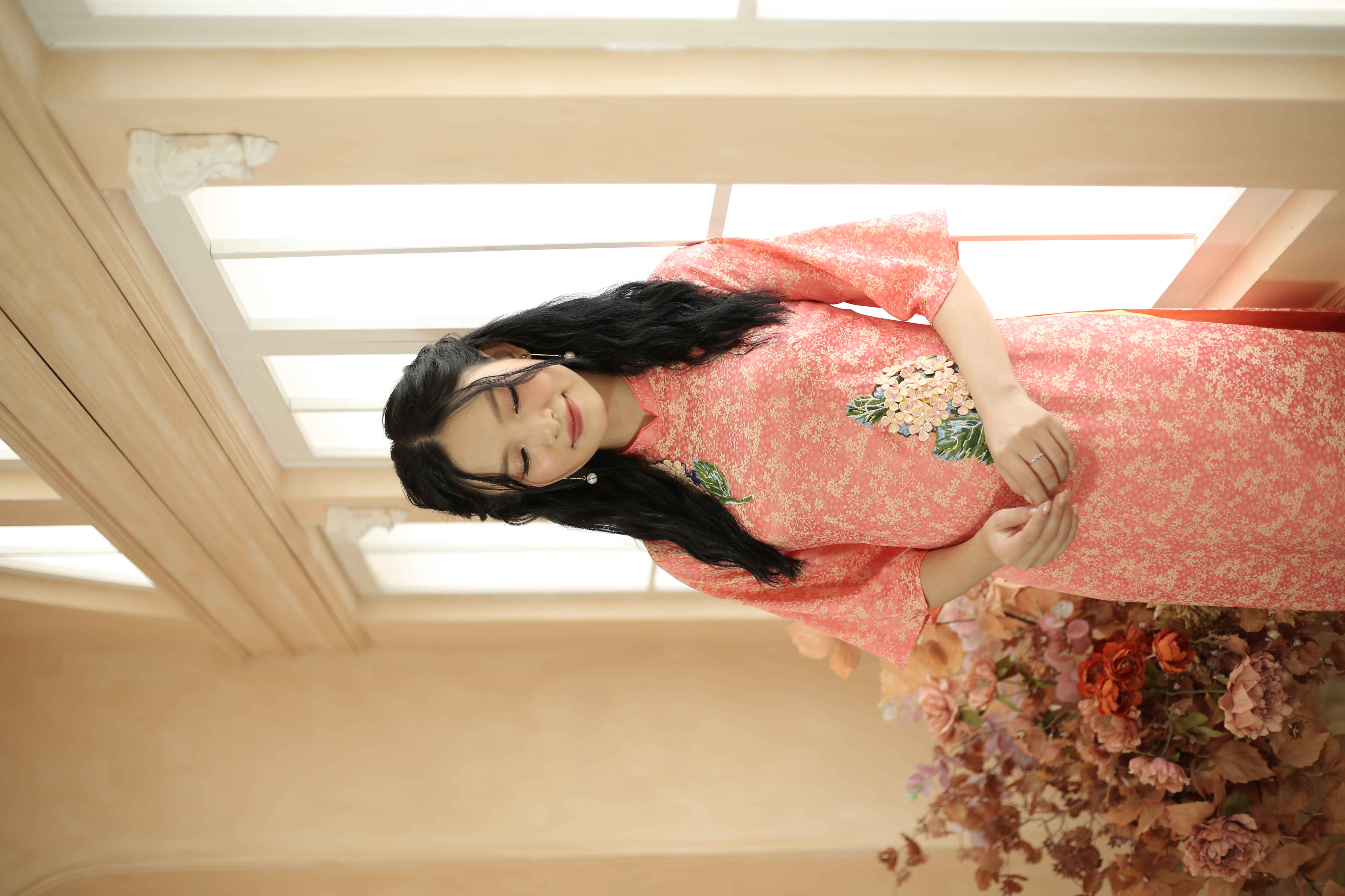 Áo dài form suông đỏ đô may bằng chất liệu lụa gấm loại 1 kết hoa và chim, tay lỡ loe, quần lụa hồng nhạt