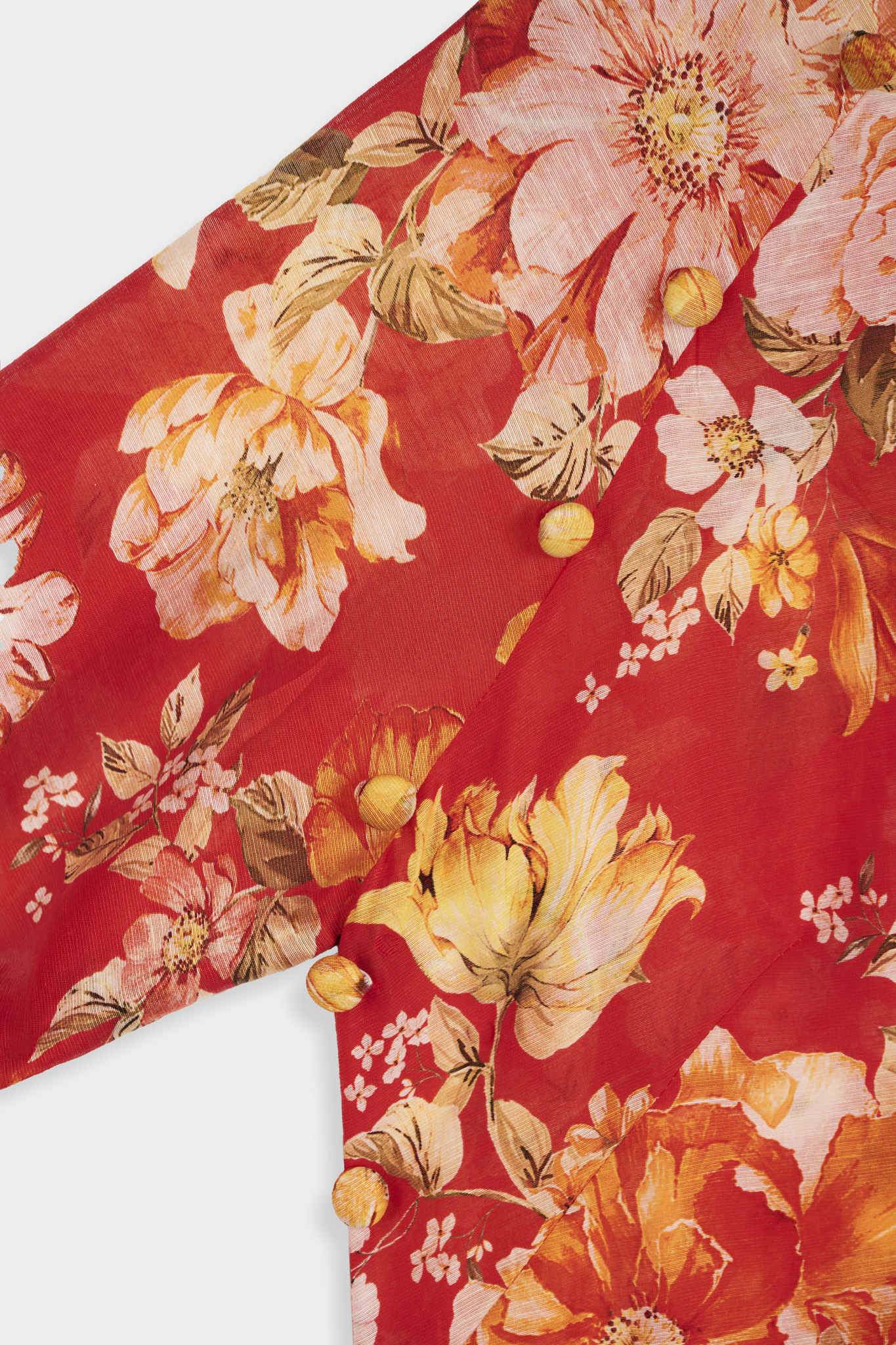 Khoác lên mình thiết kế này, ta như lạc vào một khu vườn nhiệt đới ngập tràn sức sống. Trên nền vải linen mềm mại, thoáng đãng – chất liệu lý tưởng cho những ngày ngập nắng – những đóa hoa bung nở với gam màu đỏ cam nồng ấm chủ đạo, điểm xuyết sắc vàng rực rỡ và những vệt cam cháy bỏng. Mỗi họa tiết như một nét vẽ phóng khoáng, không cầu kỳ mà vẫn đủ sức lay động mọi ánh nhìn, gợi lên cảm giác về một mùa hè sôi động, một nguồn năng lượng tươi mới, căng tràn.