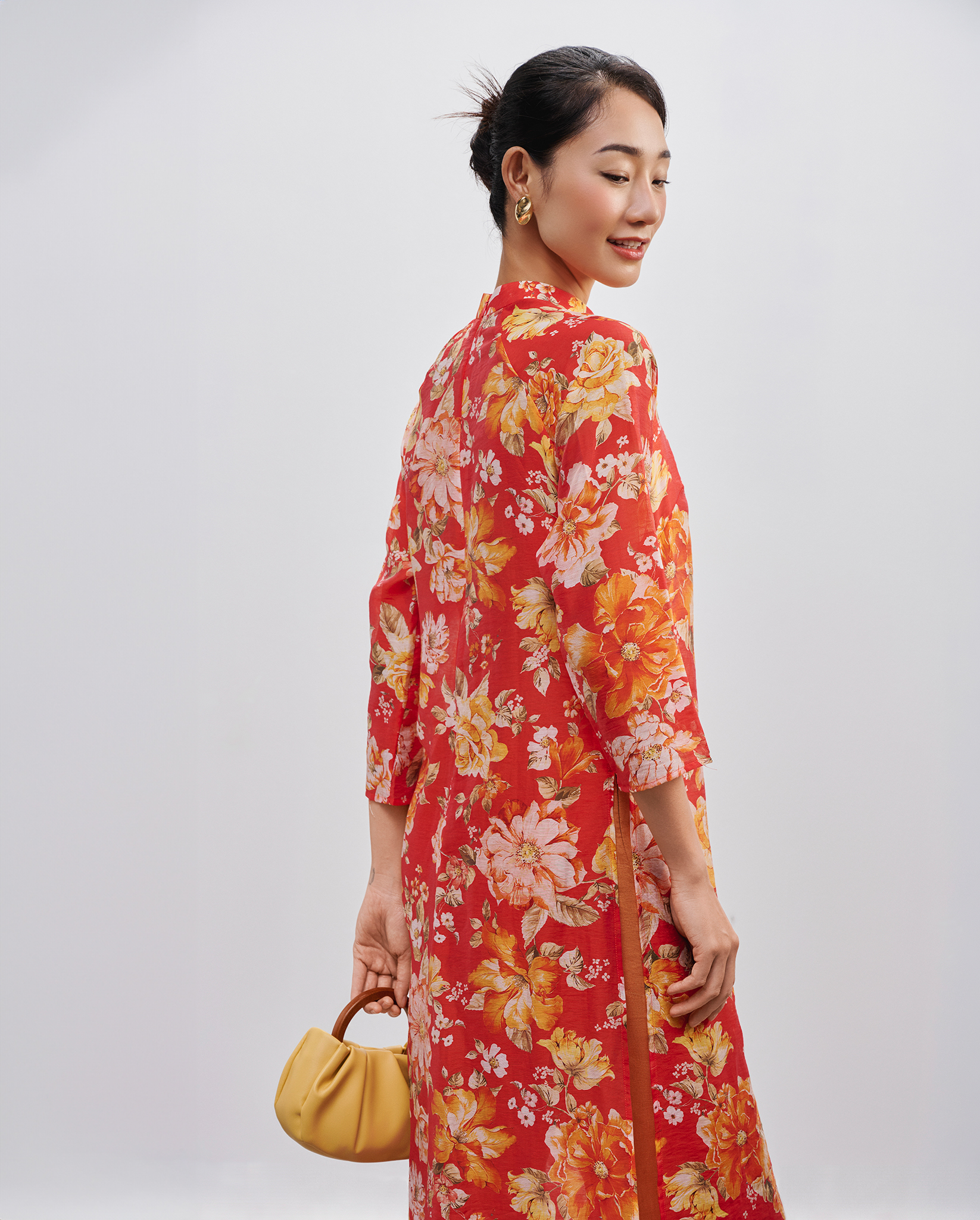 Dáng áo suông nhẹ, không quá ôm sát, vừa đủ để gợi lên những đường cong ý nhị, lại vừa mang đến sự tự do, phóng khoáng. Khi kết hợp cùng quần lụa ống rộng đồng điệu về sắc cam đất, tổng thể bộ trang phục trở nên hài hòa, thời thượng, phá vỡ những quy tắc cũ kỹ để kiến tạo một định nghĩa mới về vẻ đẹp áo dài: thanh lịch, hiện đại nhưng vẫn đậm đà bản sắc.