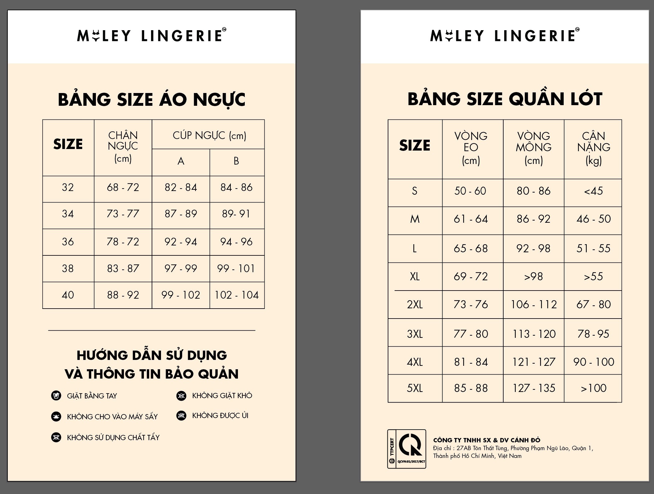 - Áp dụng đổi trả 1 lần duy nhất cho các ĐH áo ngực. Nếu Qúy KH không chắc chắn về size, Miley Lingerie khuyến khích KH nhắn tin để được tư vấn, tránh trường hợp đổi trả không mong muốn.