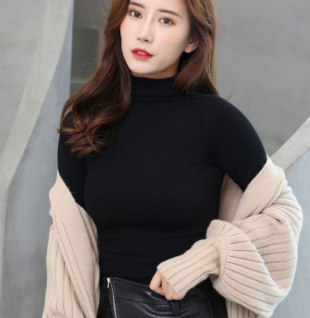 Áo giữ nhiệt nữ cổ lọ cao, sợi len mềm mại, đàn hồi tốt, ôm lấy thân hình, rất gợi cảm và nữ tính.