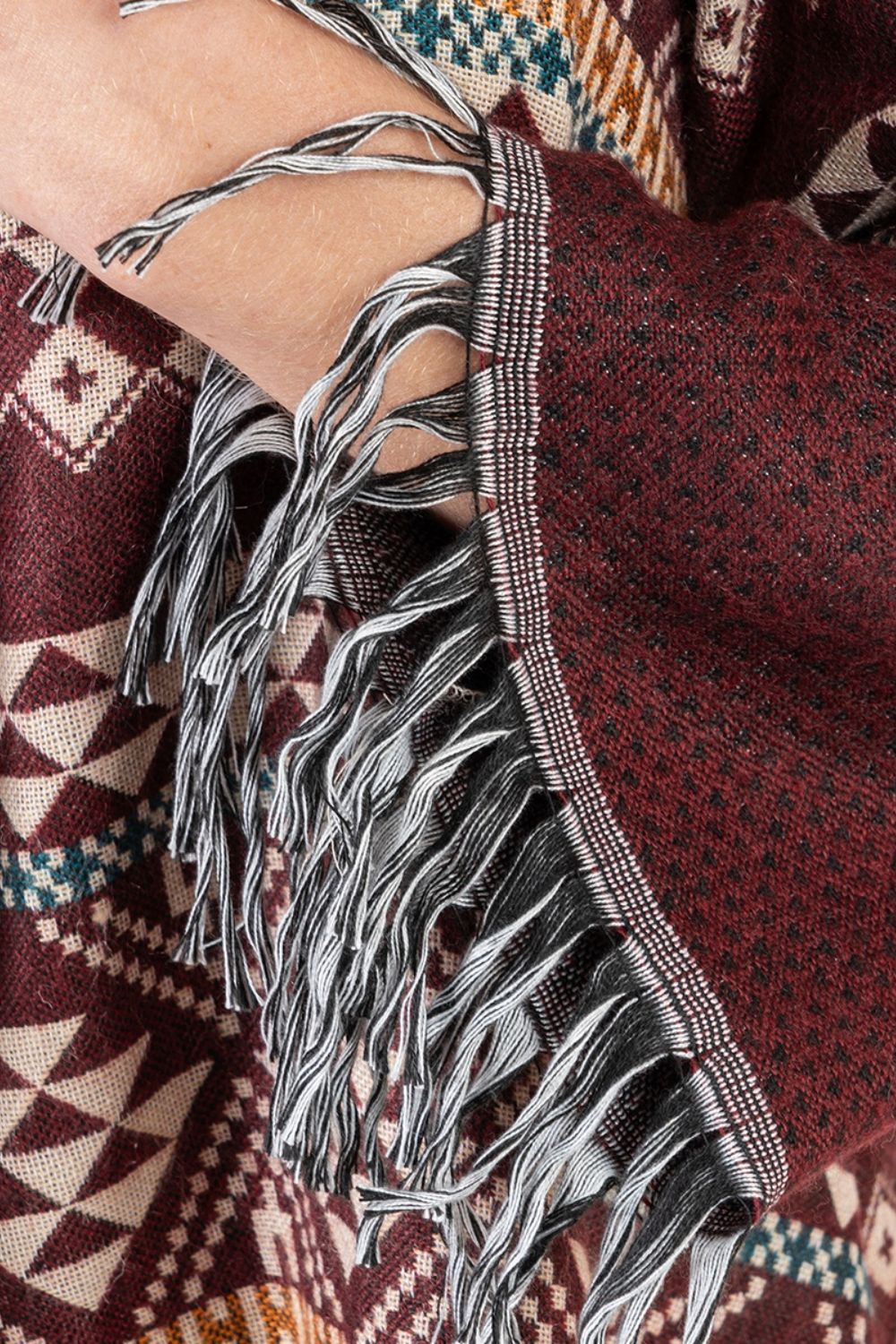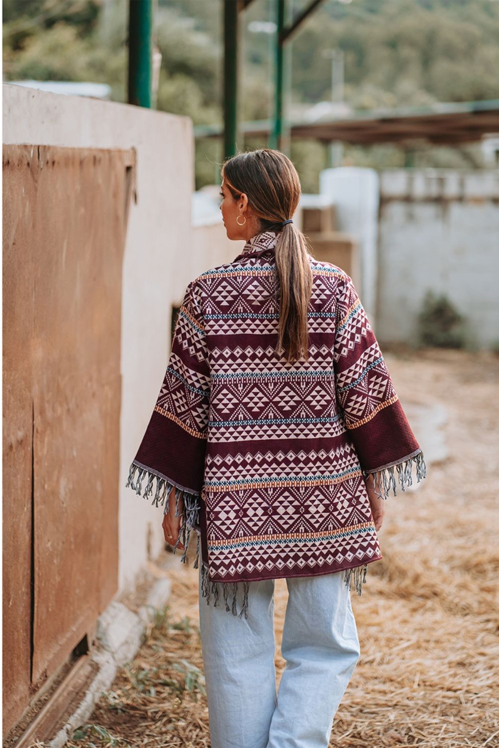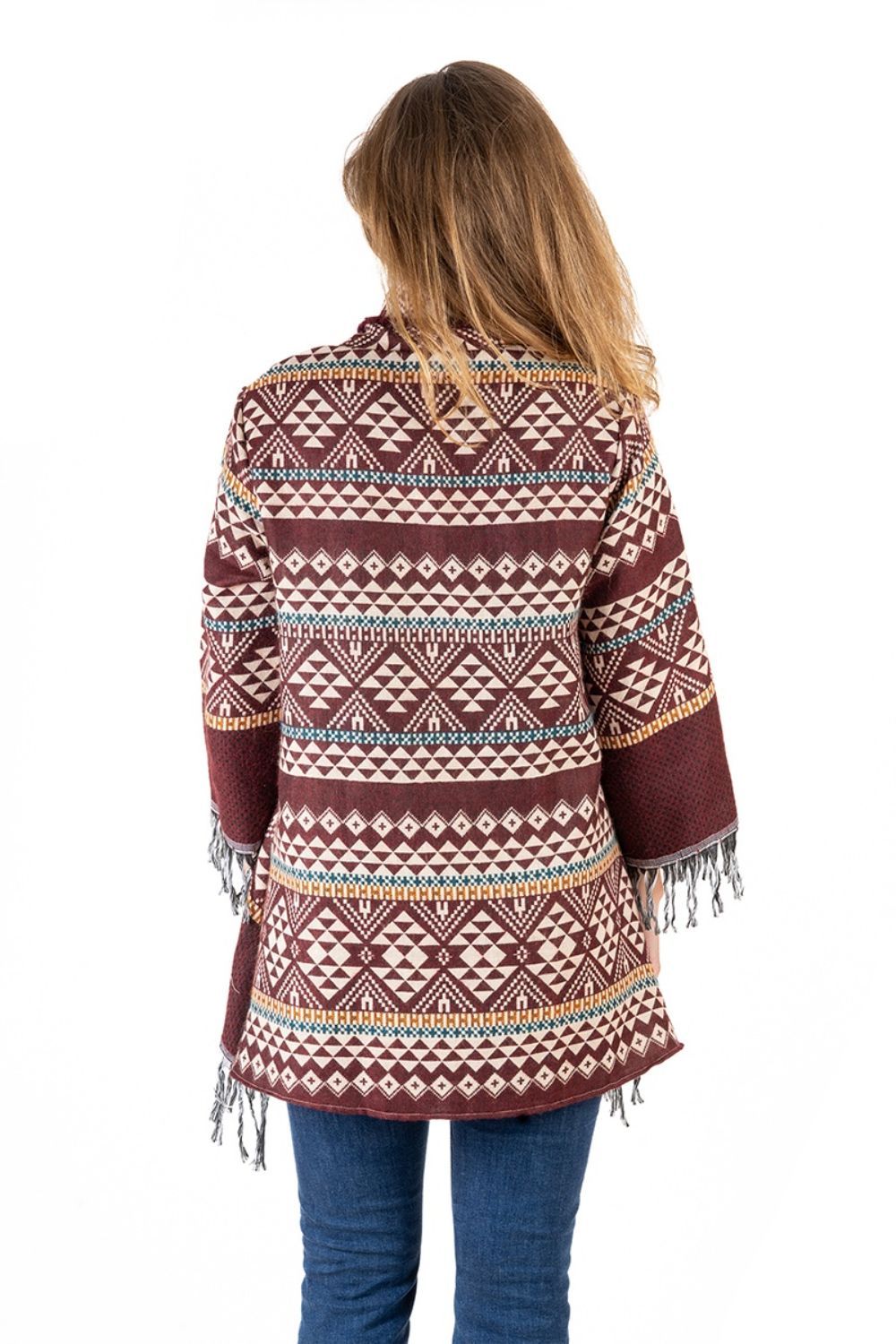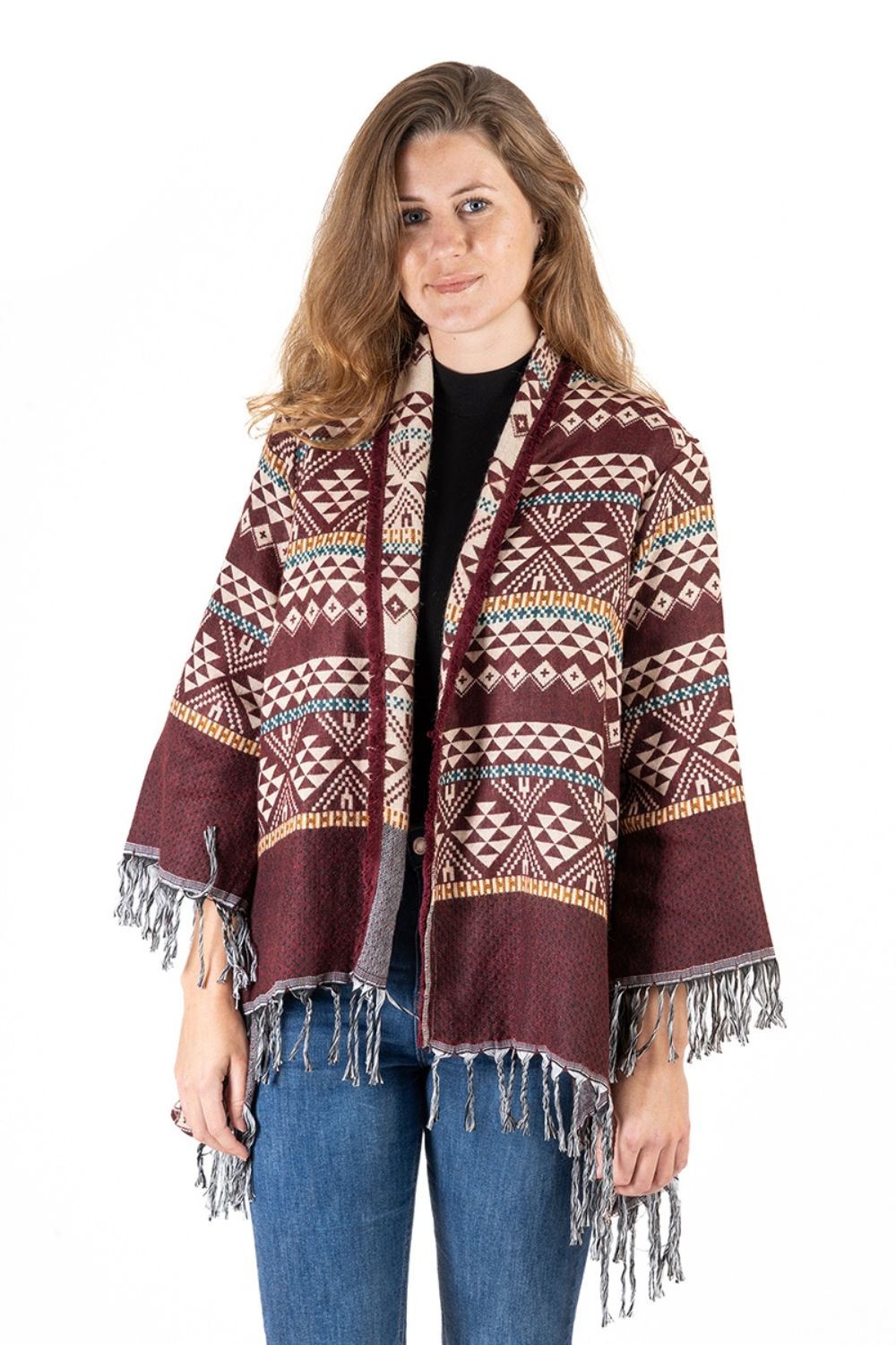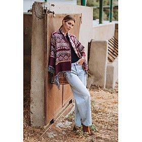 Áo Khoác Isla Bonita, kiểu áo choàng thu đông, không nút cài, họa tiết thổ cẩm độc đáo. Chất vải giống vải bố. Freestyle. Dài áo thân trước 70cm, thân sau 90cm. (50x90cm)Phù hợp đi