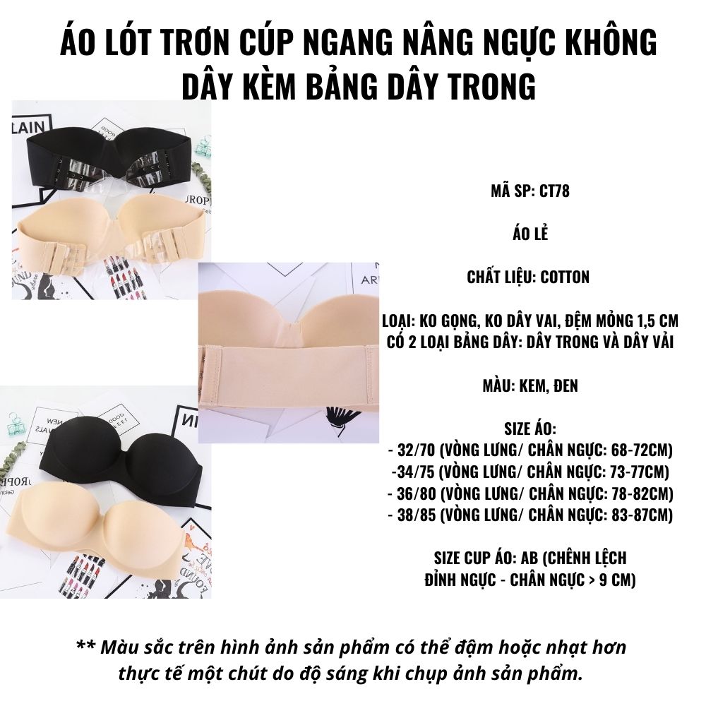 ÁO LÓT TRƠN CÚP NGANG NÂNG NGỰC KHÔNG DÂY KÈM BẢN DÂY TRONG Chất liệu: cotton mềm Loại áo: không gọng , đệm mỏng . Mẫu này cúp AB, nên phù hợp nhất cho quả