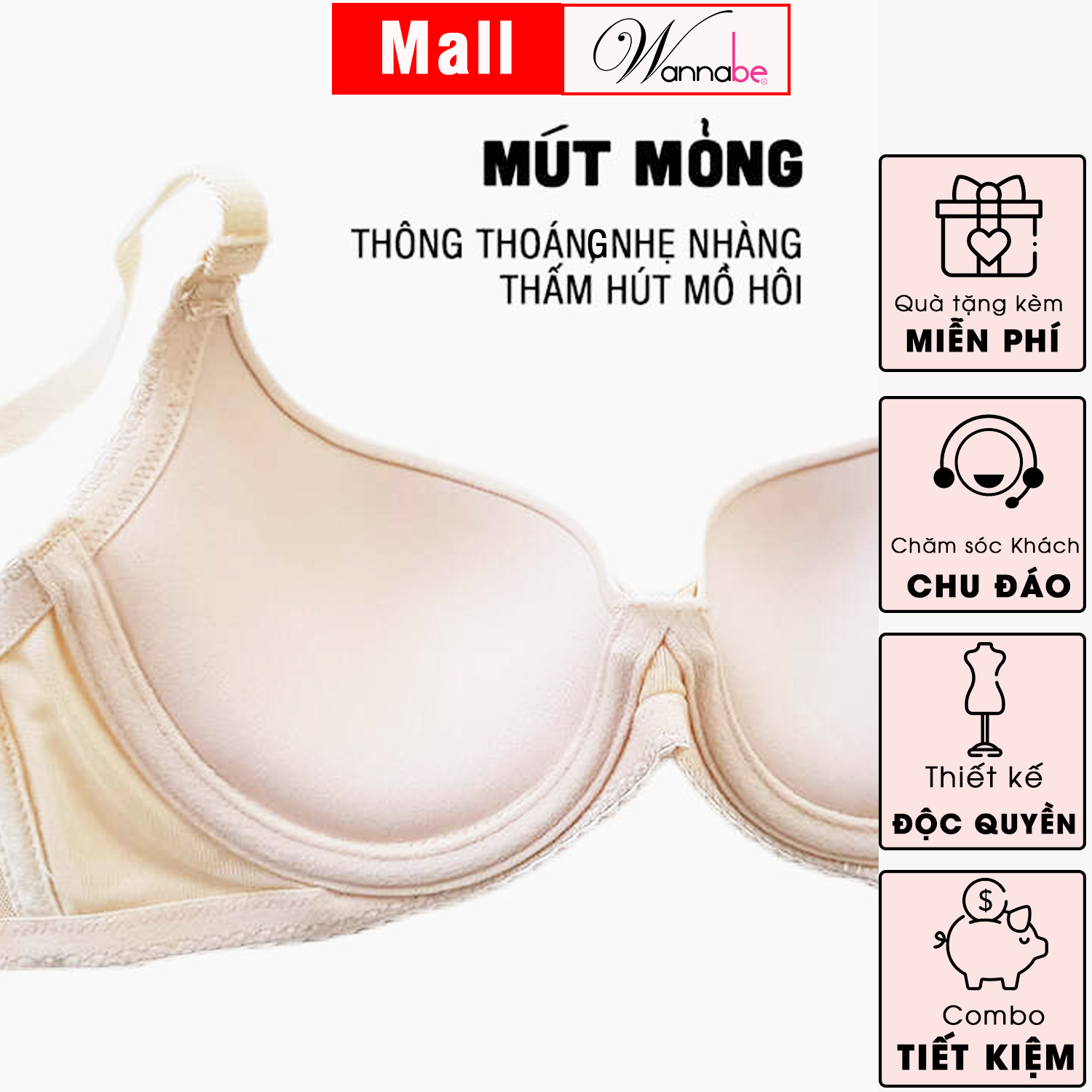 Bầu ngực: cúp xéo, mút mỏng thông thoáng, thấm hút mồ hôi tốt, tạo cảm giác mát mẻ