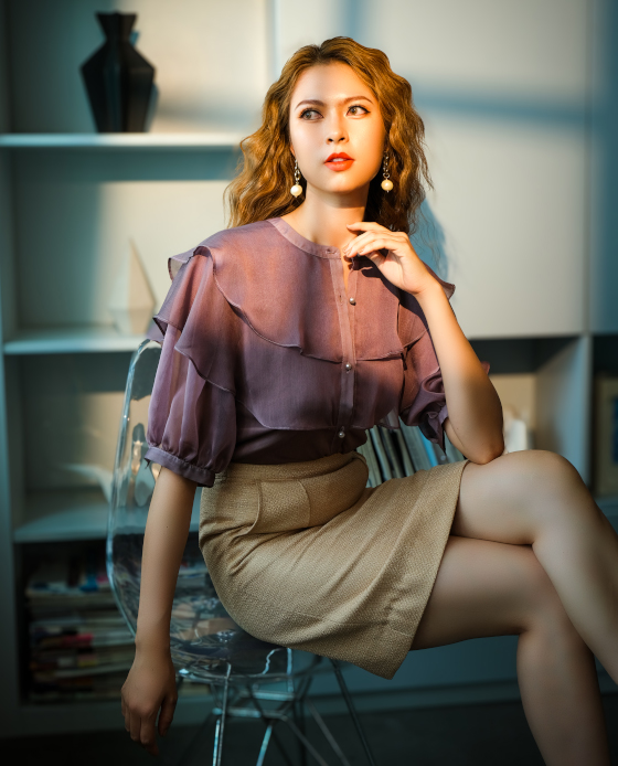 Áo dáng suông, với phần cổ cách điệu được nhún li ngực tạo phom suông rộng trẻ trung. Áo với điểm nhấn là hàng khuy trai 1 bên vài và tay bo kẹp bèo nhí