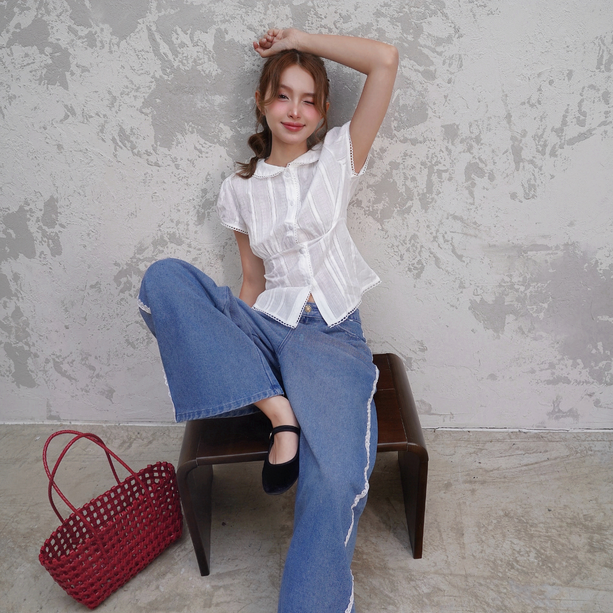 CHI TIẾT SẢN PHẨM ✿ Sản phẩm : Áo sơ mi tay ngắn viền ren dễ thương nữ tính cột nơ sau dễ phối đồ Jenni Miều Est.2013 ✿ Chất liệu : Xô Ren ✿
