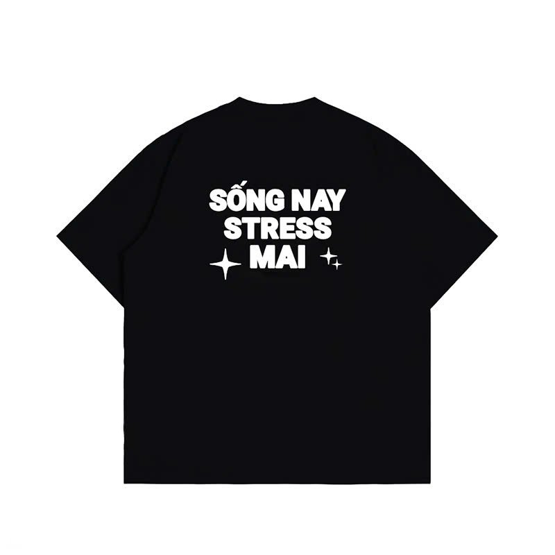 - Thiết kế in chữ "SỐNG NAY STRESS MAI" nổi bật trên nền áo tạo điểm nhấn độc đáo, giúp bạn thể hiện phong cách sống tự tin, vui tươi, và không quá lo nghĩ về những áp lực thường nhật.