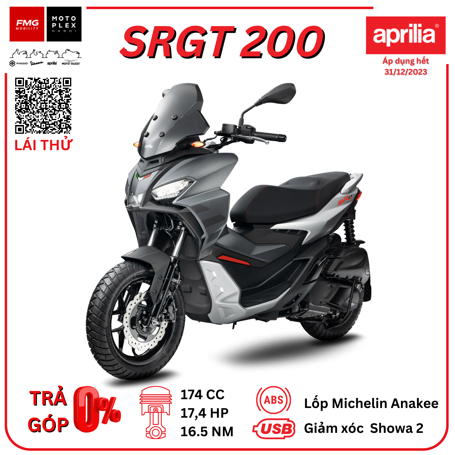 Aprilia SR GT 200 – xe tay ga đa địa hình sản xuất tại Piaggio Việt Nam, được bán ra với hai phiên bản, gồm tiêu chuẩn (đen, xám, xanh) giá 97 triệu và bản Sport (vàng đồng, xám, đỏ nhám) giá 99,5 triệu đồng. Đây là mẫu xe ga được xuất đi tất cả các thị trường trên thế giới.