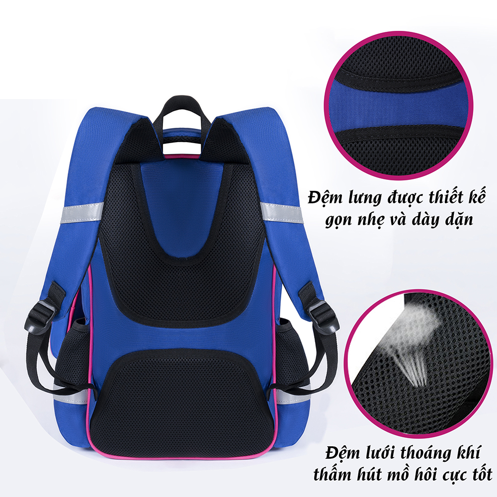 Quai đeo được thiết kế có mút đệm mềm mại tạo cho chiếc ba lô học sinh giảm áp lực trên vai cho các bé và có lớp đệm lưng thoáng mát giảm thiểu tình trạng trời oi bức