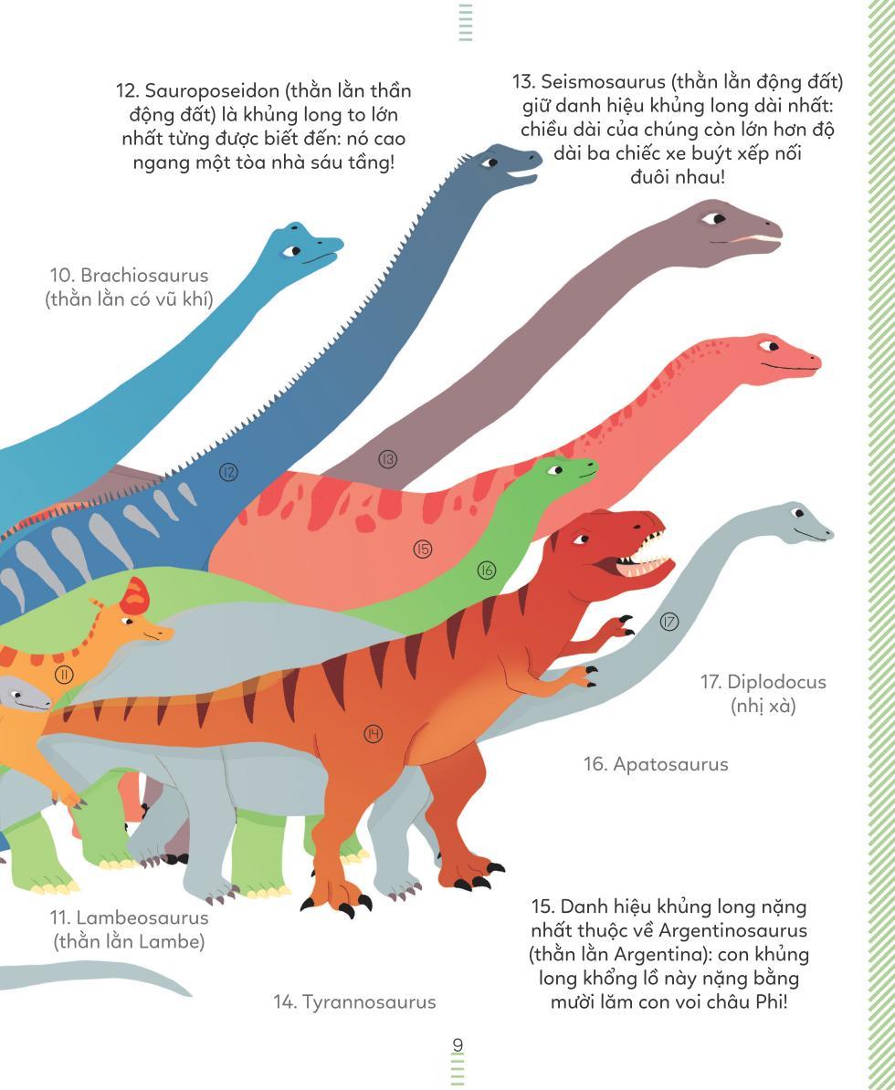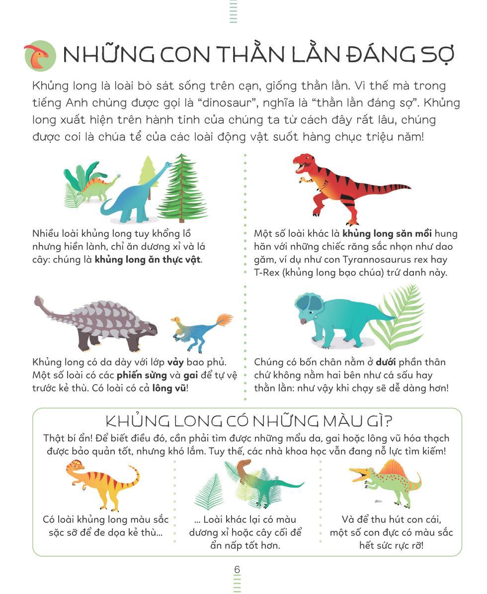 Khủng long không chỉ gồm các loài to lớn xù xì đâu, mà đa dạng và sống động hơn rất nhiều! Em có biết không, có nhiều loài khủng long bé xíu, cũng có những con to cồng kềnh nặng nề, có loài nhanh thoăn thoắt và khéo léo như tên trộm ranh ma, cũng có loài ù lì chậm chạp! Cuốn bách khoa thư sinh động này sẽ giúp em hiểu hết về các loài khủng long - sinh vật cổ đại từng thống trị mặt đất!
