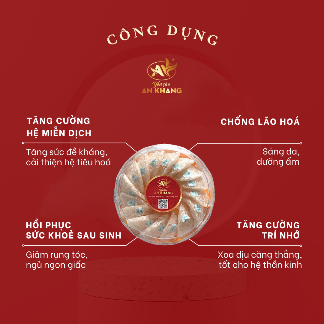 Tác dụng của tổ yến Đối với cơ thể, tổ yến có tác dụng toàn diện trên hệ thần kinh, hệ hô hấp, hệ tiêu hóa và rất nhiều cơ quan khác. Cứ trong 100g