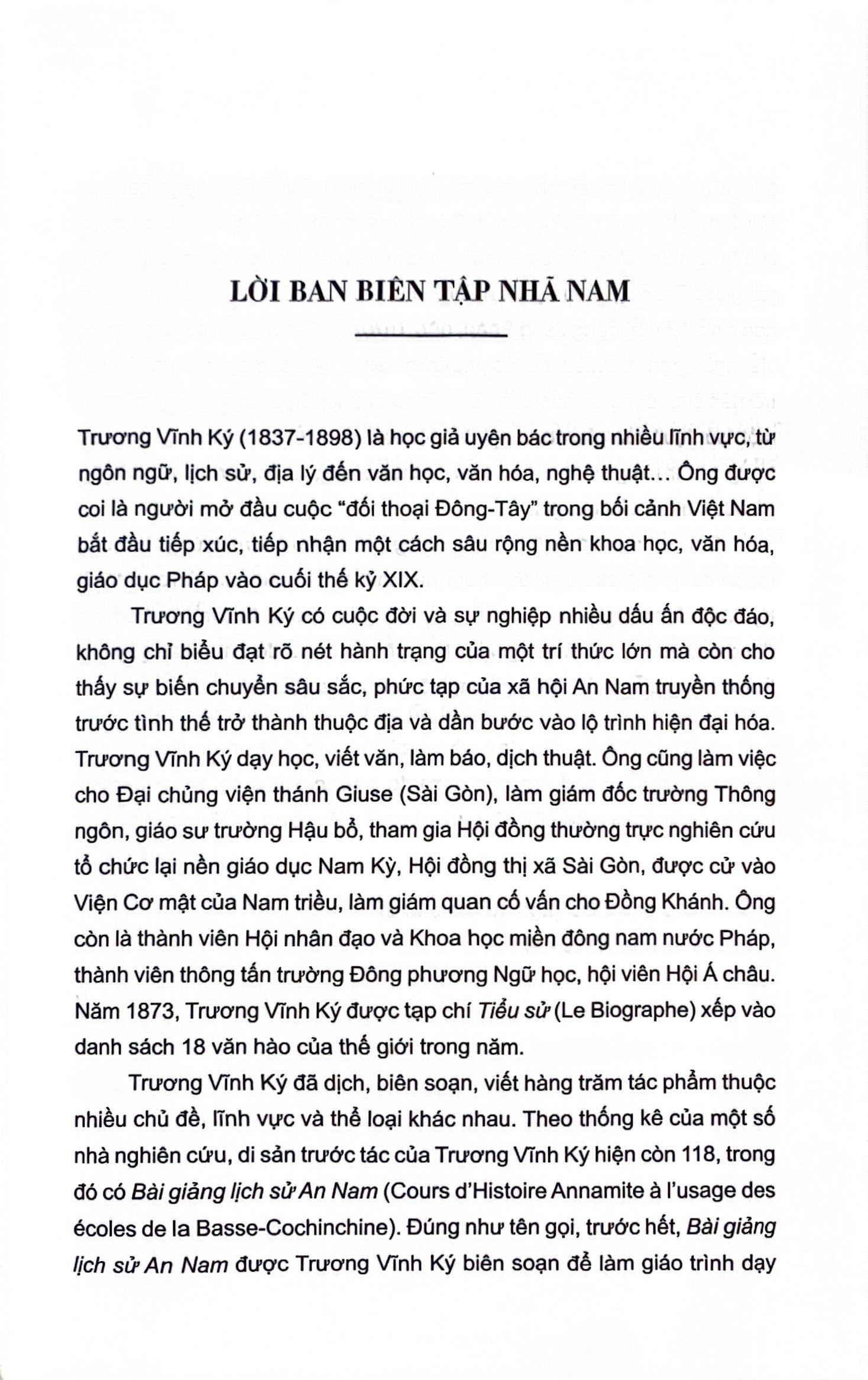 Bài giảng lịch sử An Nam là công trình được Trương Vĩnh Ký tổng hợp và nghiên cứu từ nhiều nguồn tư liệu, viết về lịch sử Việt Nam xuyên suốt các thời kỳ, từ triều đại Hồng Bàng thị, trải qua một ngàn năm Bắc thuộc, cho đến thời kỳ đầu Pháp tiến vào Việt Nam. Tác phẩm này vốn được biên soạn nhằm mục đích giúp học trò của Trương Vĩnh Ký học ngoại ngữ thông qua lịch sử nước nhà, nên nội dung trong cuốn sách này hướng đến đại đa số người đọc phổ thông, khiến những câu chuyện lịch sử hiện lên một cách hết sức gần gũi, dễ hiểu.