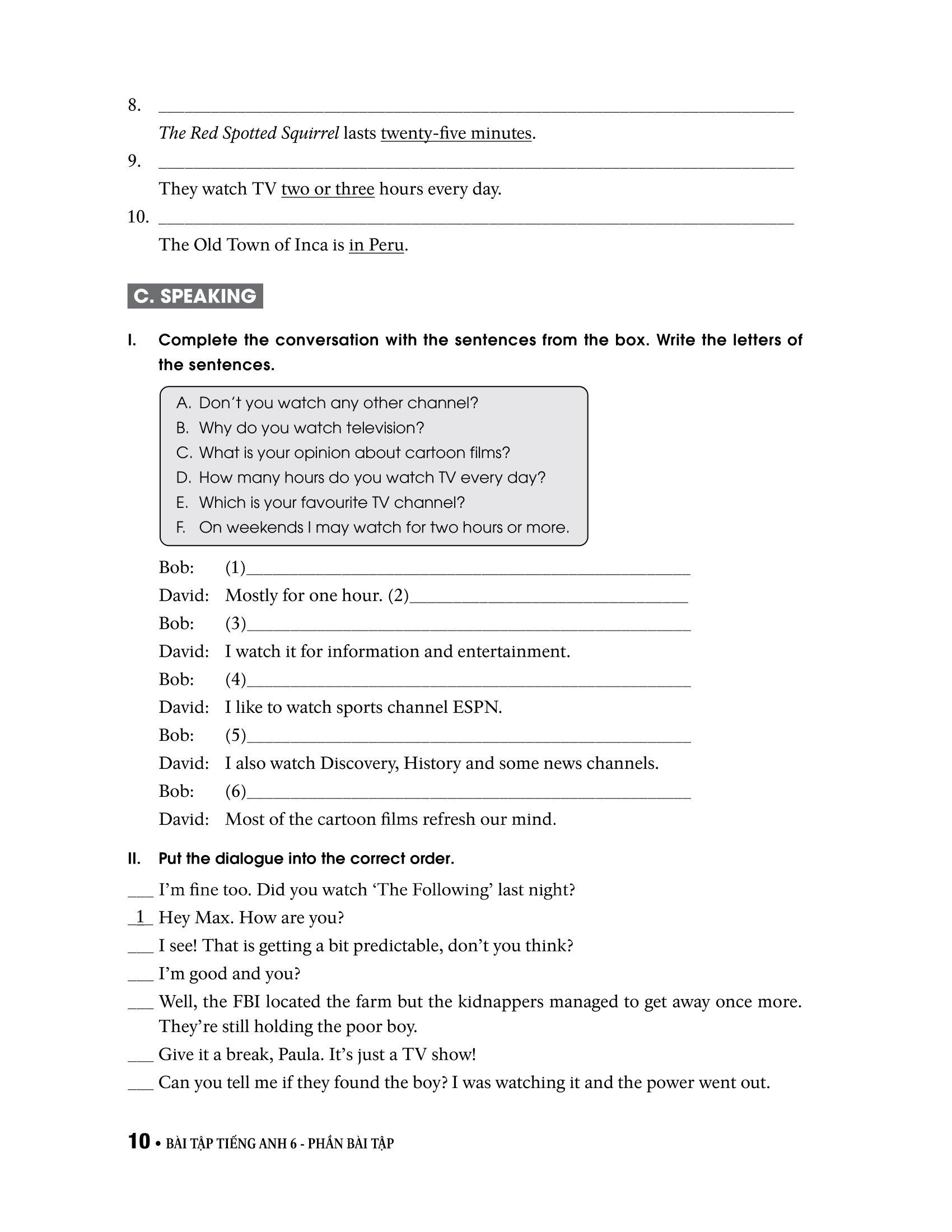 Phần C - Speaking: các bài tập đặt câu hỏi, hoàn tất đoạn hội thoại, sắp xếp đoạn hội thoại, giúp rèn luyện kỹ năng nói.