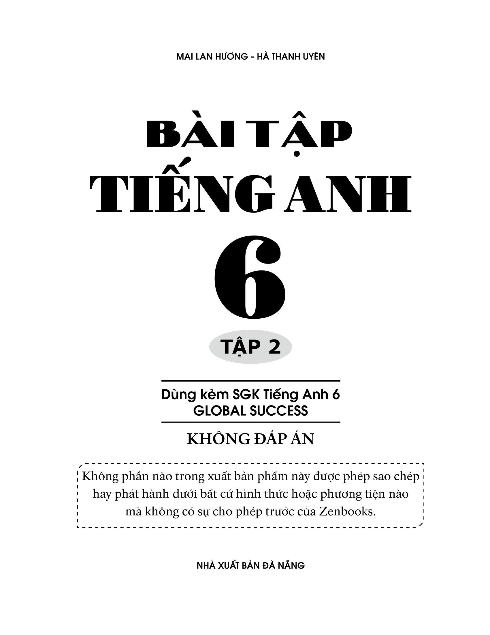Bài tập tiếng Anh 6 gồm hai tập tương ứng với hai tập sách giáo khoa Tiếng Anh 6 − Global Success của Nhà Xuất Bản Giáo dục Việt Nam.