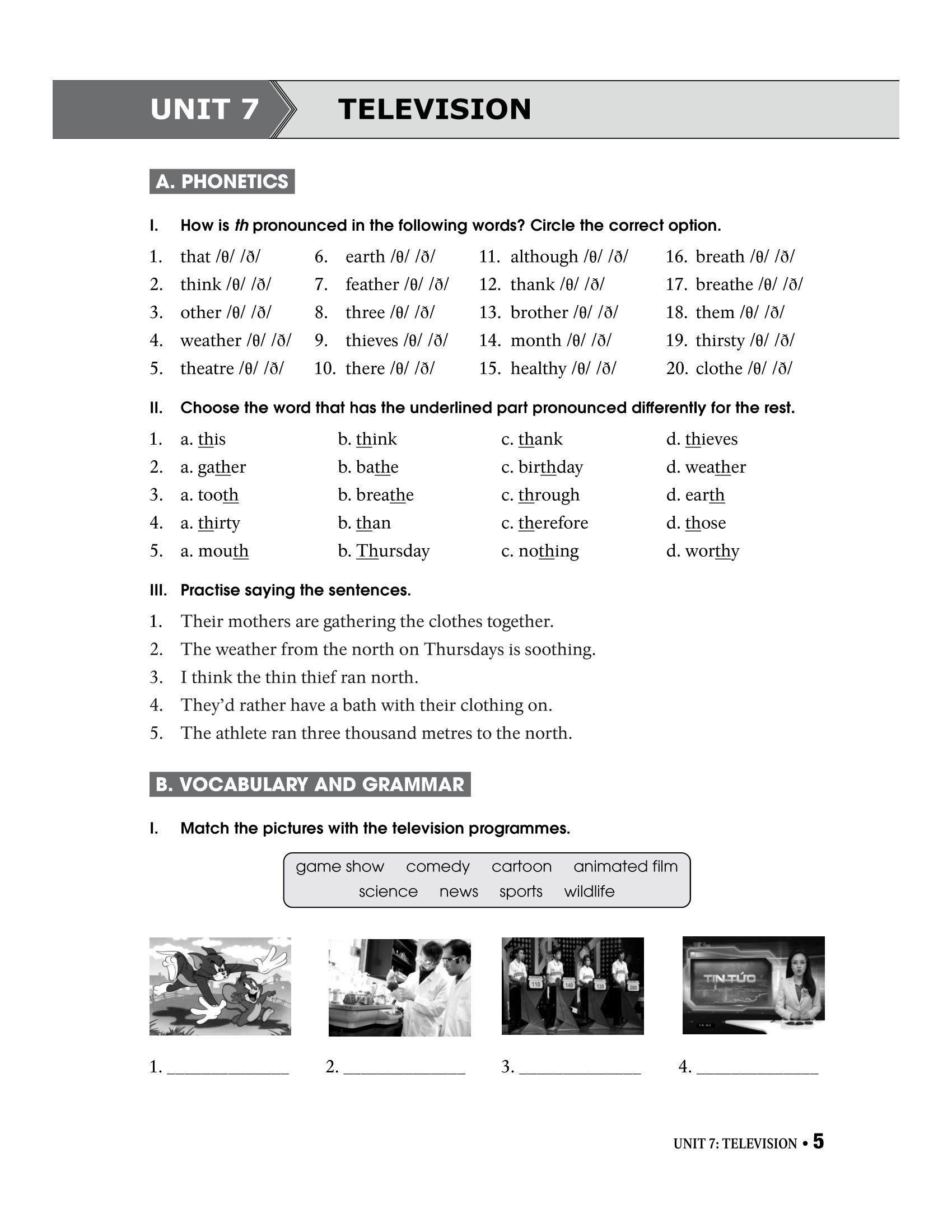 Phần B - Vocabulary and Grammar: các bài tập về từ vựng và ngữ pháp giúp ôn luyện từ vựng và củng cố kiến thức ngữ pháp trong từng đơn vị bài học.