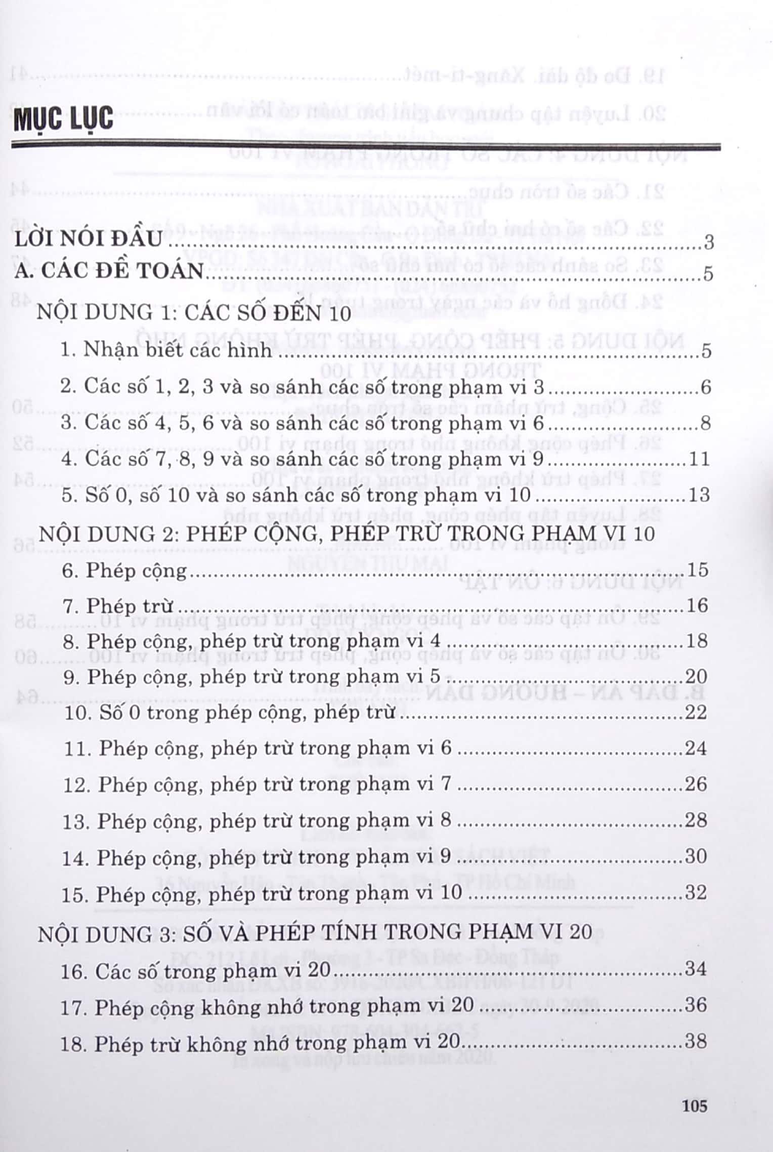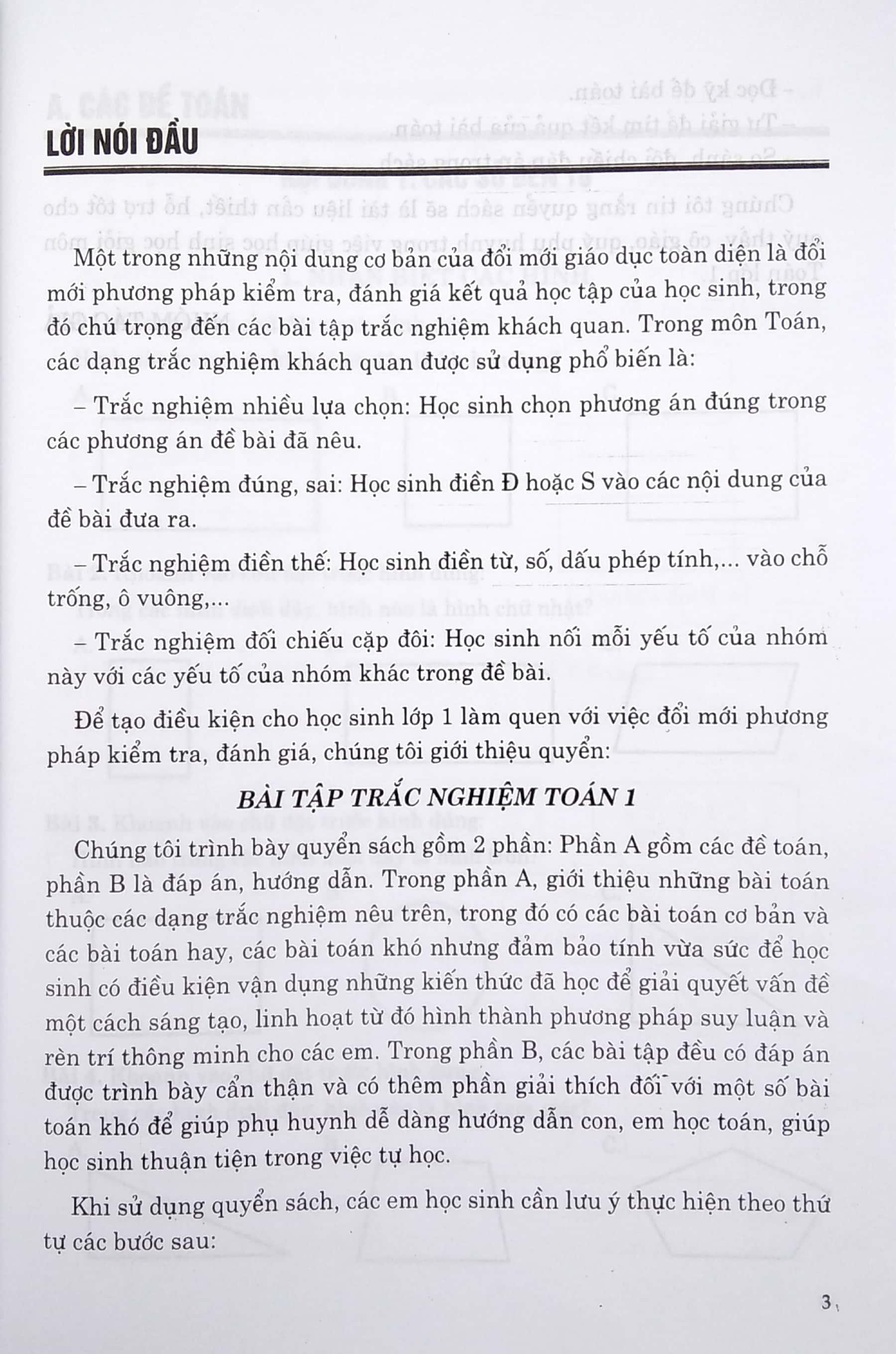 BÀI TẬP TRẮC NGHIỆM TOÁN 1 Chúng tôi trình bày quyển sách gồm 2 phần: Phần A gồm các đề toán, phân B là đáp án, hướng dẫn. Trong phần A, giới thiệu những bài toán thuộc các dạng trắc nghiệm nêu trên, trong đó có các bài toán cơ bản và các bài toán hay, các bài toán khó nhưng đảm bảo tính vừa sức để học sinh có điều kiện vận dụng những kiến thức đã học để giải quyết vấn đề một cách sáng tạo, linh hoạt từ đó hình thành phương pháp suy luận và rèn trí thông minh cho các em. Trong phần B, các bài tập đều có đáp án được trình bày cẩn thận và có thêm phần giải thích đối với một số bài toán khó để giúp phụ huynh dễ dàng hướng dẫn con, em học toán, giúp học sinh thuận tiện trong việc tự học.
