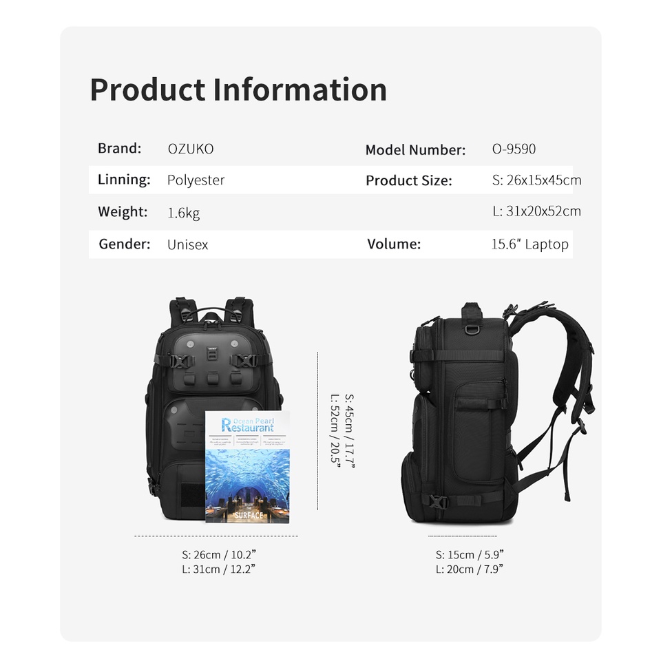 Thương hiệu: OZUKO Mô hình: 9799 Chất liệu chính: Oxford Chất liệu lót: Polyester Kích thước: 28x18x46cm (11.02x7.09x18.11 inch) Trọng lượng: 1400g / 3.1lb Giới tính: Unisex Các tính năng: * Chất liệu Oxford bền